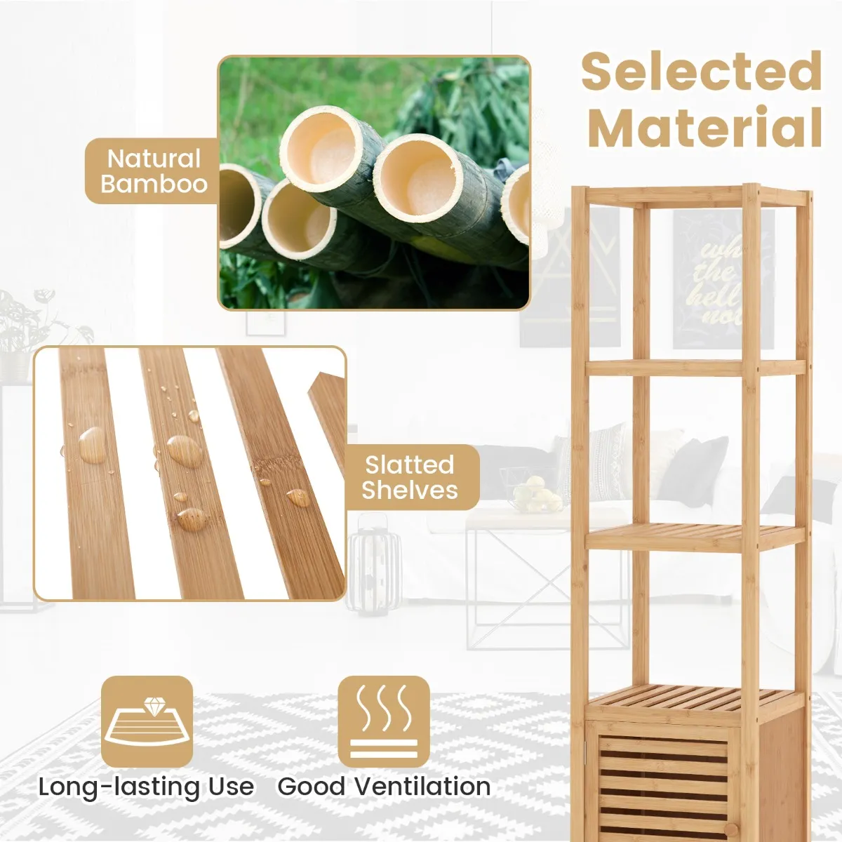 Veelzijdig gebruik:Â Deze 140 cm hoge bamboe opbergkast biedt voldoende verticale opbergruimte zonder veel vloeroppervlak in beslag te nemen. Het vrijstaande ontwerp zorgt voor een naadloze integratie in elke hoek van uw badkamer, woonkamer, studeerkamer, keuken en meer.
