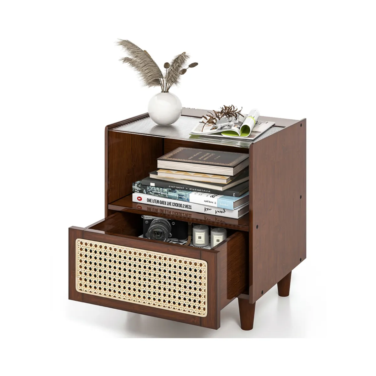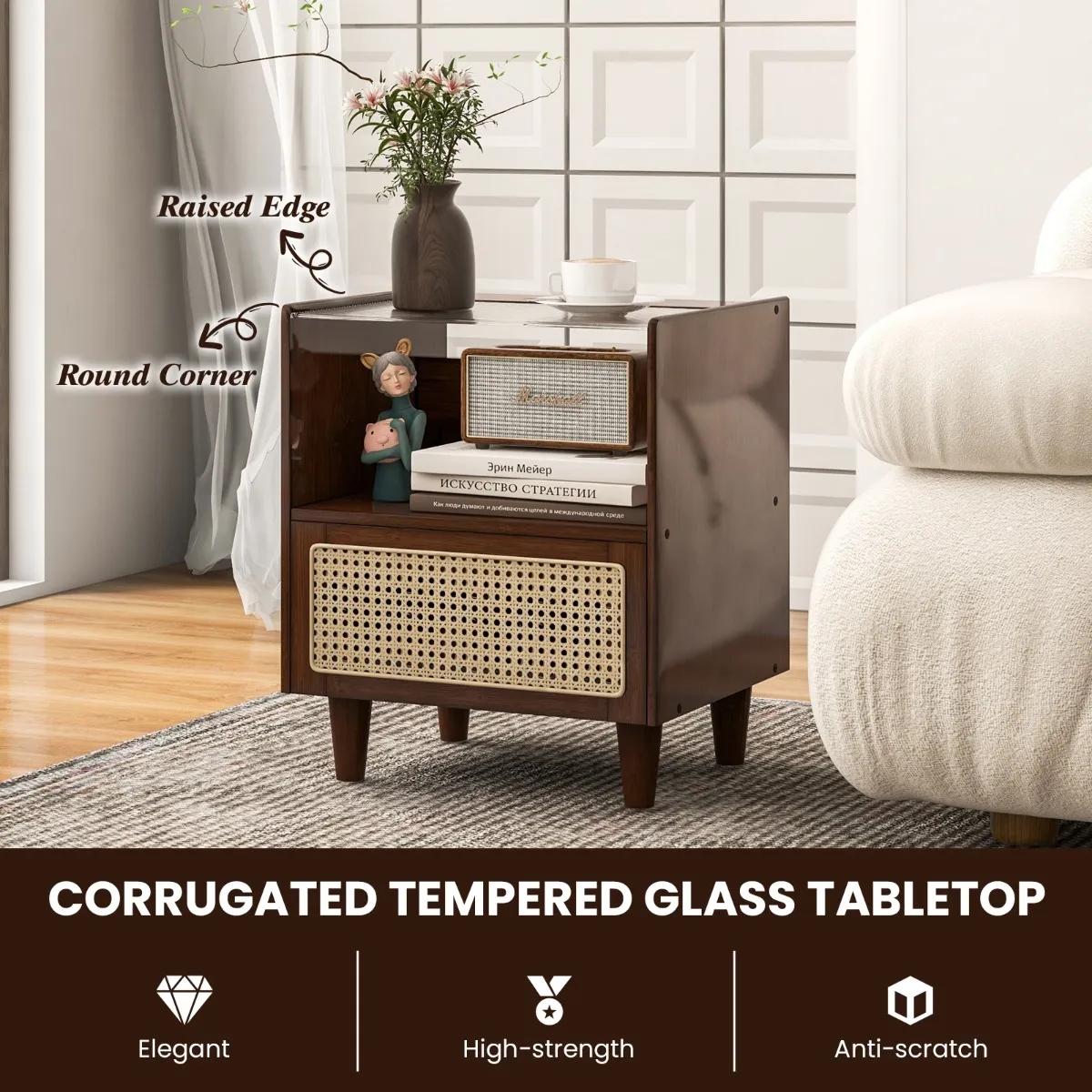 Ruimtebespaarder: Dit nachtkastje heeft ook een golvend blad van gehard glas, een open vak en een praktische rotan lade, waardoor er meer opbergruimte ontstaat. En de opstaande randen voorkomen dat spullen eraf vallen.