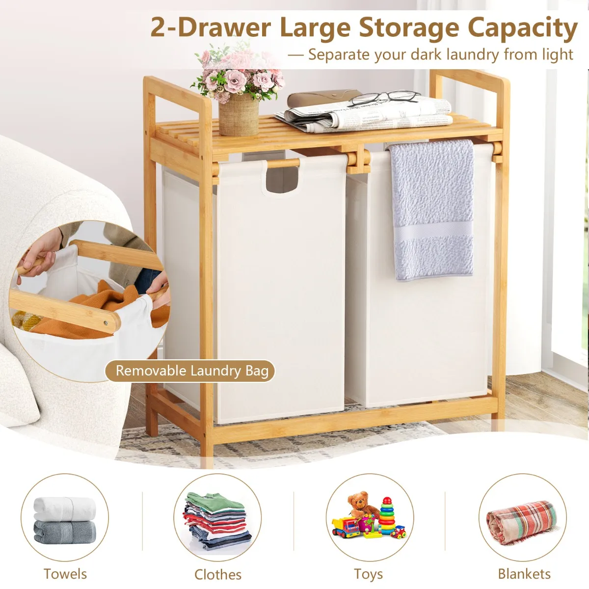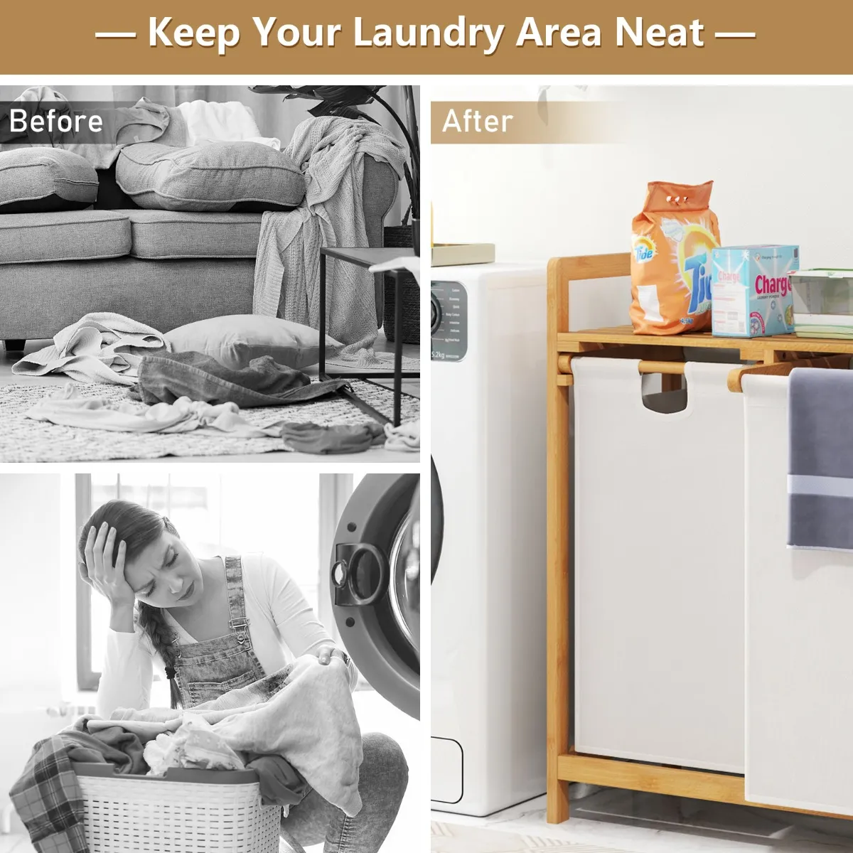 Gemaakt van 100% natuurlijk bamboemateriaal, is deze wasmand stabiel, duurzaam en veilig voor langdurig gebruik. Onze bamboe wasmand wordt geleverd met 2 verschuifbare waszakken, zodat u de lichte en donkere kleding gemakkelijk en snel kunt sorteren. De stoffen waszakken zijn uitneembaar, zodat u ze gemakkelijk kunt vervoeren van slaapkamers, kasten of badkamers naar de wasserij voor gemakkelijk wassen en drogen. Bovendien is deze wasmand ontworpen met een opbergplank aan de bovenkant, die perfect is voor het opbergen van wasmiddel, wasverzachter, droogdoekjes, bleekstiften, handdoeken of wat decoraties. En het kan ook dienen als werkruimte om kleding op te vouwen. Dankzij de handgreep aan beide zijden is deze wasmand gemakkelijk te verplaatsen.
