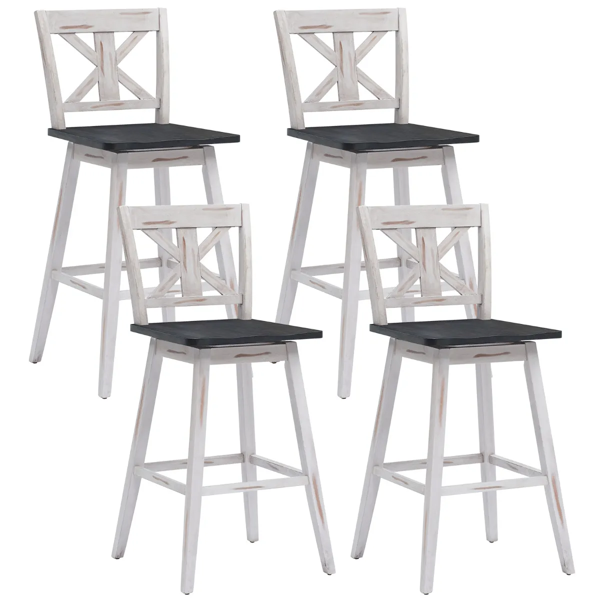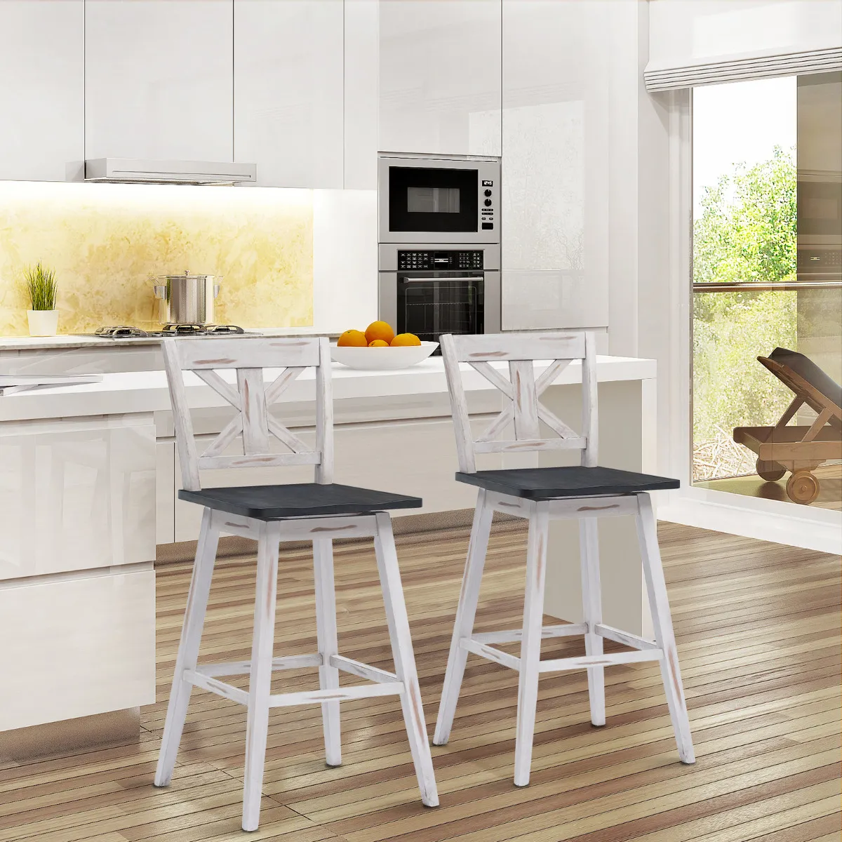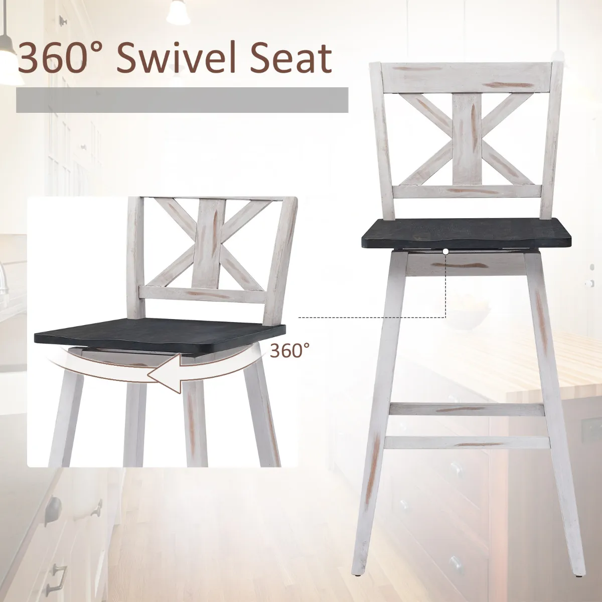 Rubber hout materiaal sterk verbetert stevigheid, die blijkt uit de totale gewichtscapaciteit van 97 kg. Tijdens het feest bespaart de 360° draaibare zitting u veel moeite om met mensen in verschillende richtingen te praten. En hoe lang uw feest ook duurt, de ergonomische rugleuning en gebogen zitting zullen uw lichaam goed ondersteunen. En de 26,5 cm hoge voetsteun zal uw voeten ontlasten. Elke kruk ziet er zeer aantrekkelijk en vintage uit. U kunt de krukenset plaatsen in uw thuiskeuken, bar, restaurant en café.