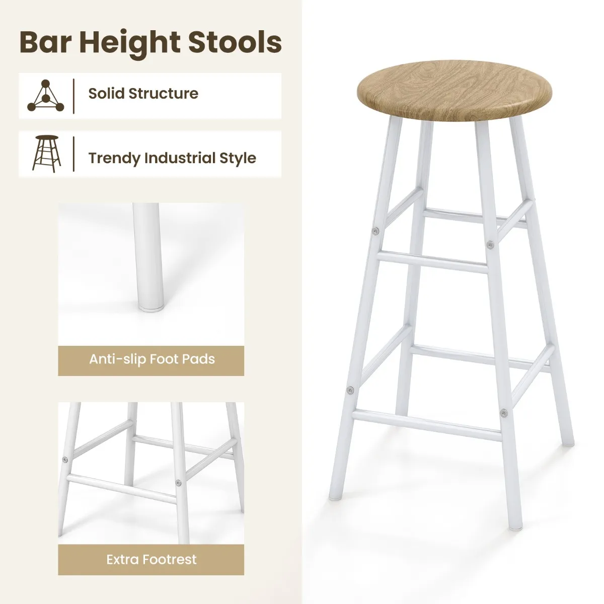 Versterkte structuur: De 3-delige bartafel en krukset is gemaakt van hoogwaardig materiaal en heeft een vrij stevige constructie die veel gewicht kan dragen (het tafelblad kan tot 100 kg dragen en de kruk 150 kg). Bovendien versterkt de driehoekige structuur onder het tafelblad deze zelfs voor een langere levensduur.