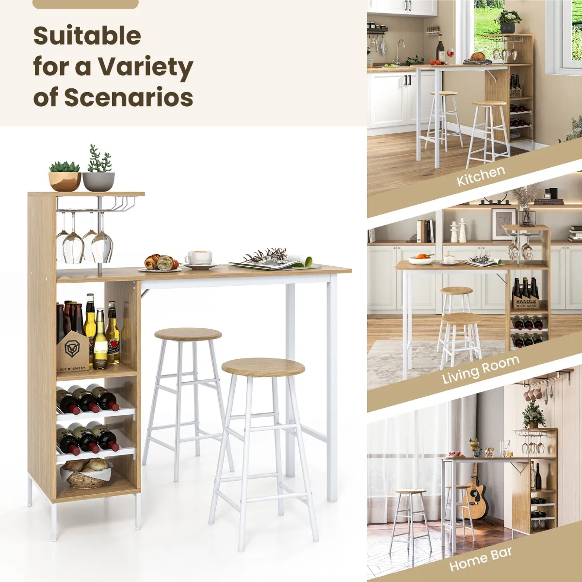 Ontworpen voor wijnliefhebbers: De bartafel biedt opbergruimte op maat voor wijnen en steelware. De wijnglashouder onder het tafelblad is geschikt voor bordeauxglazen, champagneglazen, cocktailglazen, enz., terwijl het 2-tier wijnrek tot 6 flessen kan bevatten. Er zijn ook 3 multifunctionele zijplanken voor keukengerei en andere kleine voorwerpen.