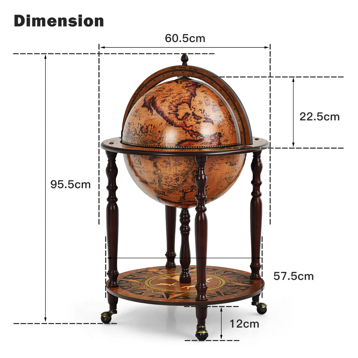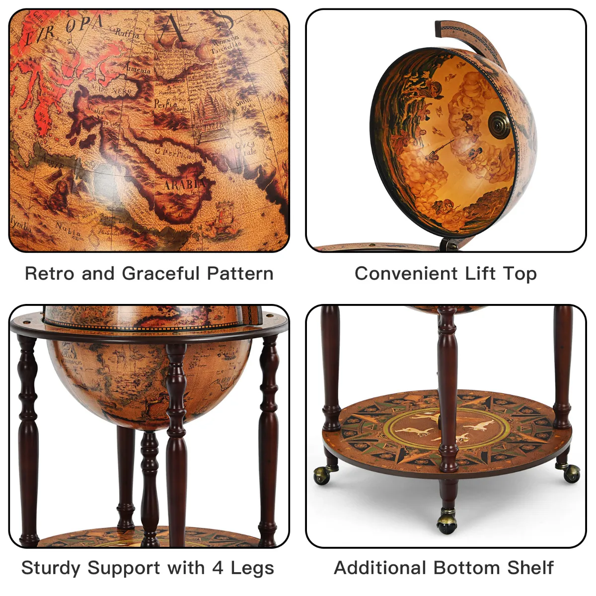 【Flexibele wielen voor gemakkelijke verplaatsing】Deze wereldbol wijnkast is uitgerust met 4 soepel rollende wielen aan de onderkant, die veel gemak brengen om te verplaatsen waar u maar wilt. U zult niet alleen van de schoonheid van deze wijnbar standaard genieten maar ook van het praktische nut dat het aan u bracht, die het op om het even welke plaats kunt toepassen u wilt.