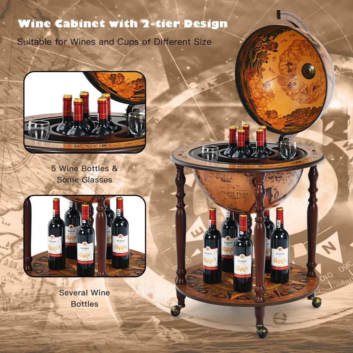 【Retro & Uitstekende verschijning】Geschilderd in 16e eeuwse oude wereldkaart om zijn retro stijl te verhogen, voegt het wijnkast een vleugje elegante charme aan uw kamer toe. Bovendien combineert het unieke wereldwijde ontwerp functionaliteit en functionaliteit in één, wat geschikt is voor verschillende wijnproef locaties, zoals woonkamer, eetkamer enzovoort.