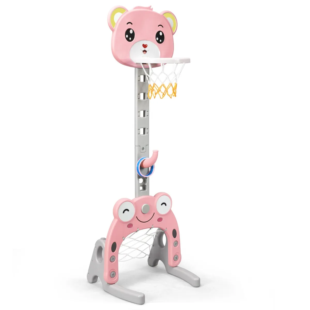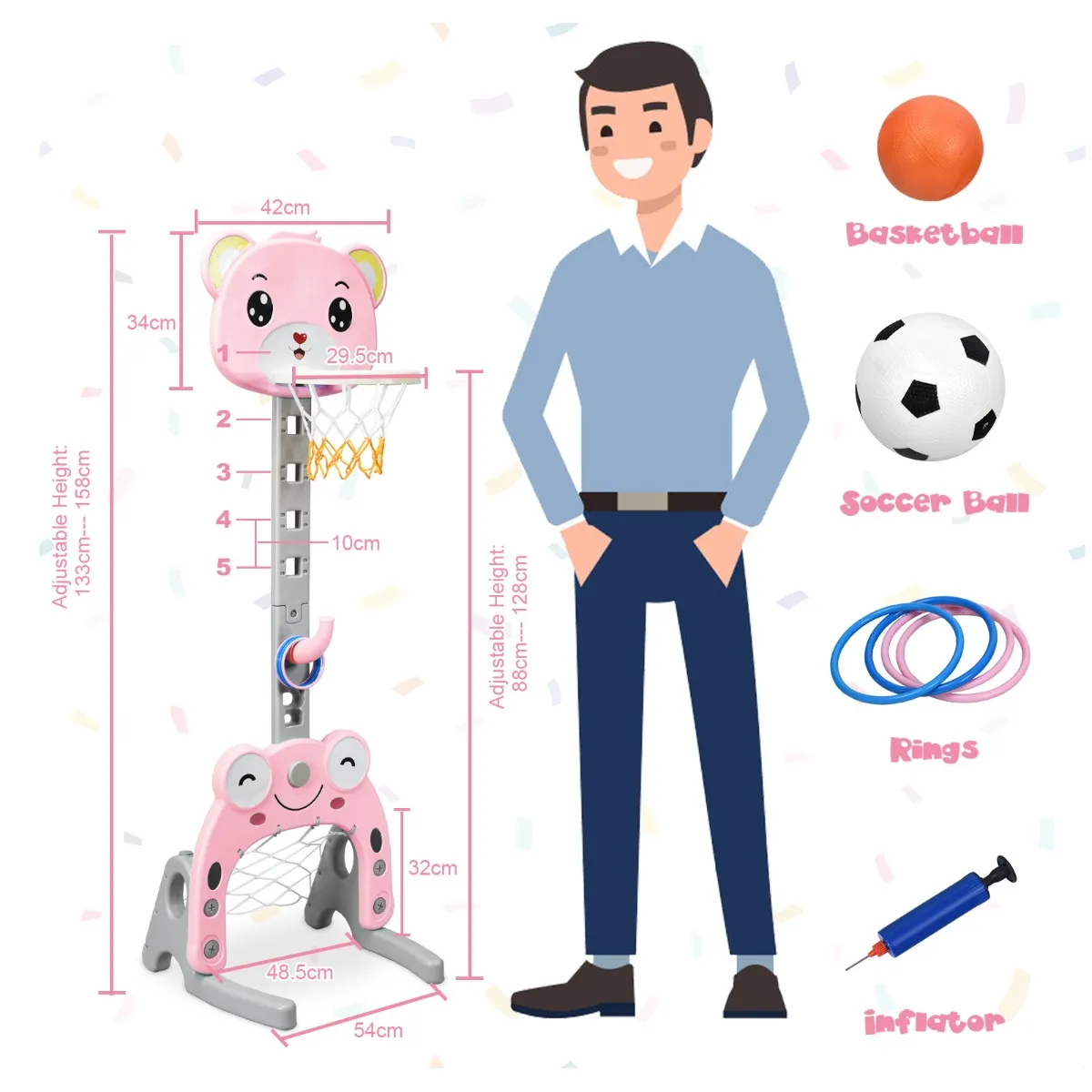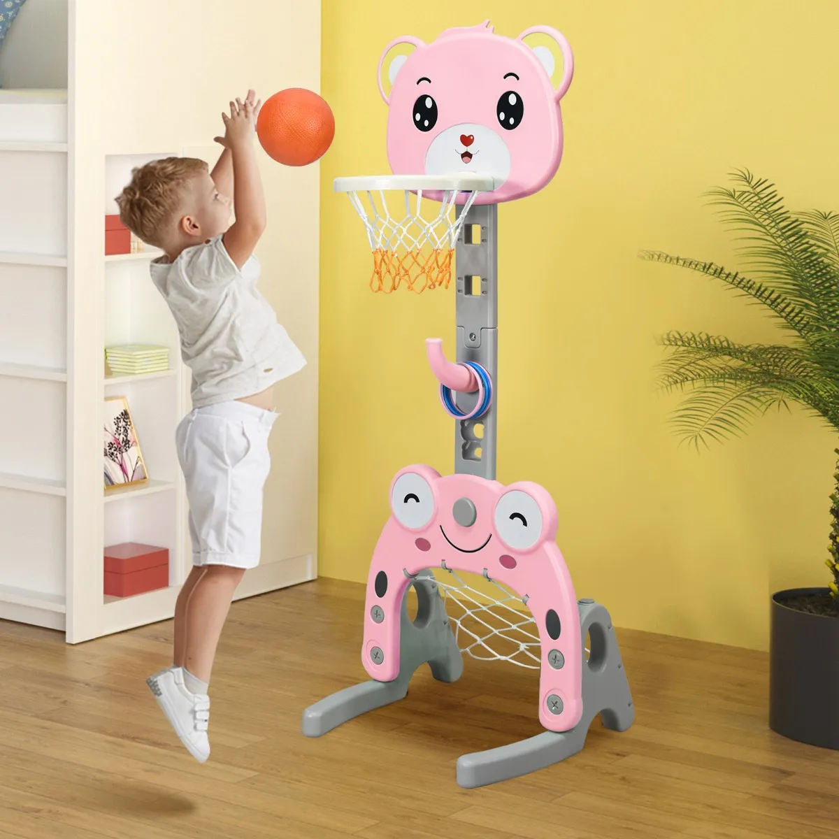 3-in-1 basketbalstandaard, waarmee kinderen kunnen basketballen, voetballen en ringgooien