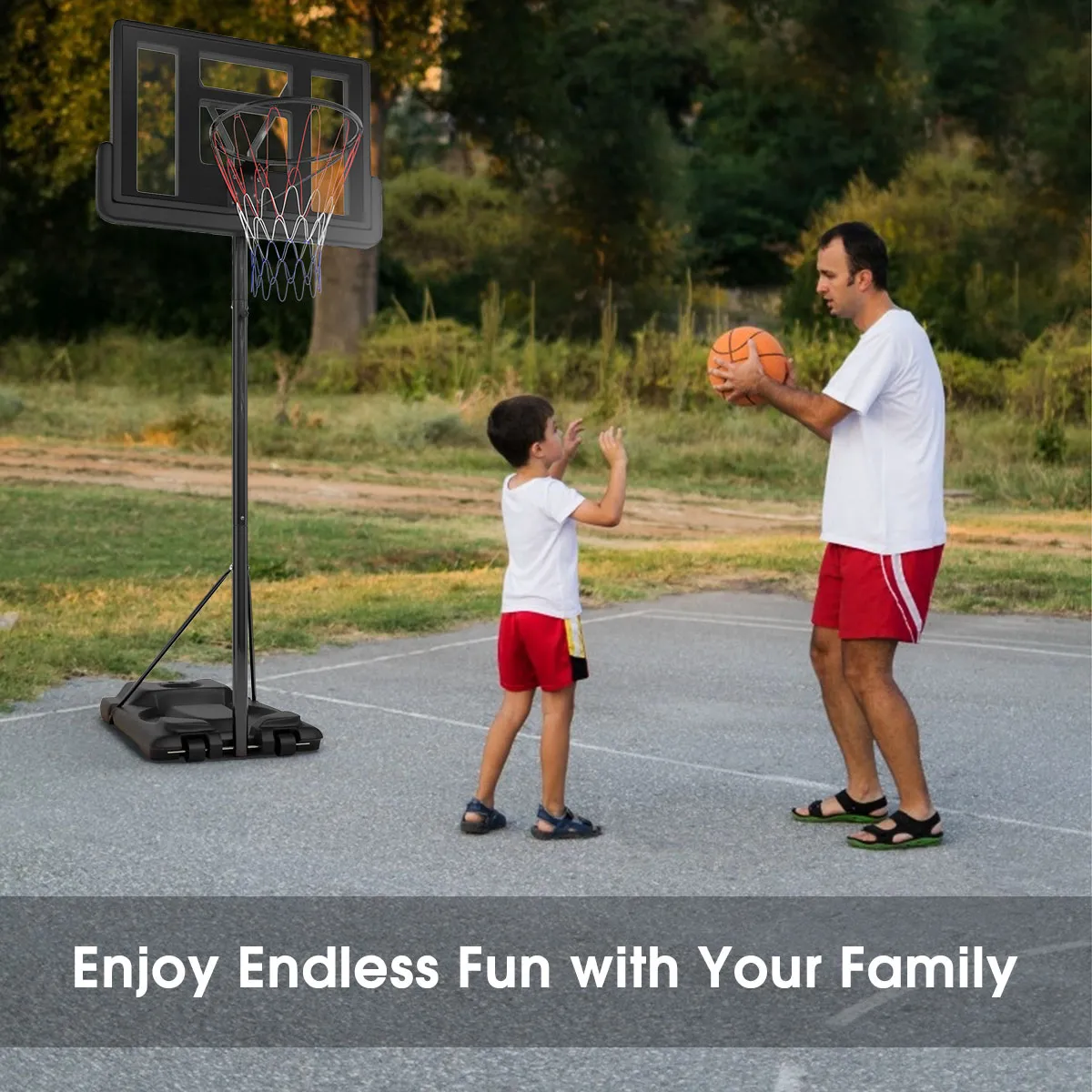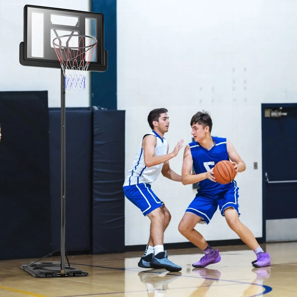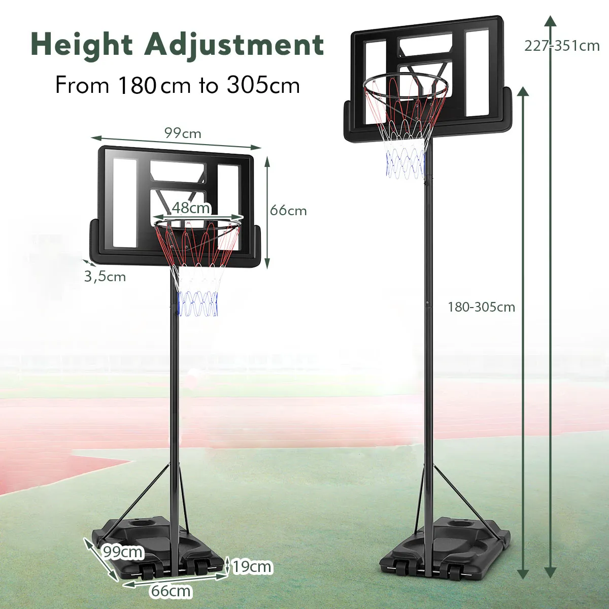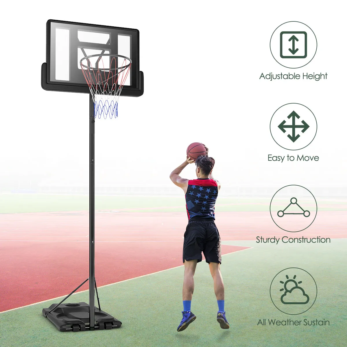 Het in hoogte verstelbare basketbal hoepel systeem heeft het voordeel dat het geschikt is voor mensen van verschillende hoogtes. Gemaakt van breukvast PE backboard, weerbestendig nylon net en stalen buis, de hoepel standaard is stevig en duurzaam voor langdurig gebruik. Gevuld met water of zand, het basketbal doel is stabiel en veiliger voor u om plezier te hebben. Uitgerust met 2 wielen, beweegt het basketbal rek soepel naar verschillende plaatsen zoals scholen, sportscholen, zwembad en meer.