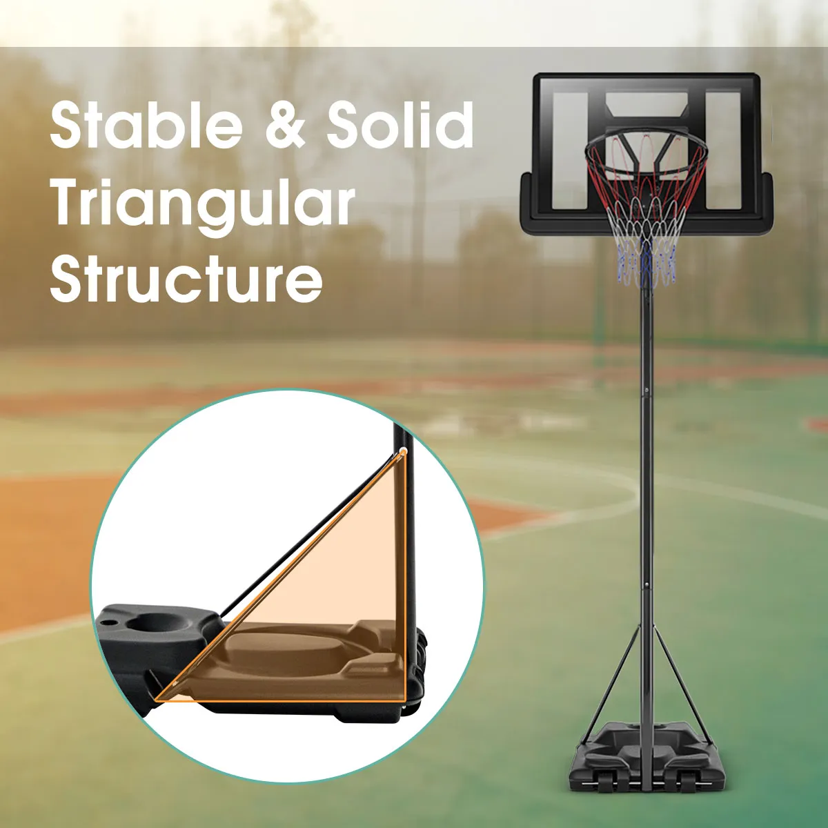 【Stevige vulbare basis met ronde uitsparing】De basis kan worden gevuld met water of zand om een goede stabiliteit en veiligheid voor uw elke schot te garanderen. De driehoekige structuur en de strakke verbinding zorgen voor extra stevigheid van het doelsysteem. Bovendien zorgt een handige ronde uitsparing op de basis ervoor dat de basketbal stabiel blijft staan.