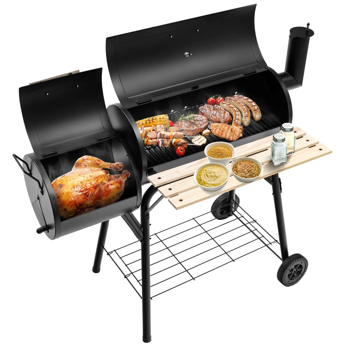 Deze vuurplaats voor buiten heeft een uniek en stijlvol ontwerp met een hoogwaardige metalen constructie. Met smoker en houtskoolgrill geniet je tegelijkertijd van gegrilde en gerookte vleesgerechten. Dankzij de ingebouwde thermometer is een nauwkeurige temperatuurregeling gegarandeerd voor de beste prestaties. Als het om de voedselbereiding gaat, bieden het bijzettafeltje en de onderste plank voldoende ruimte om ingrediënten, gereedschap en accessoires binnen handbereik te houden. Dankzij de twee grote wielen is de grill gemakkelijk van de ene plaats naar de andere te vervoeren en is hij perfect voor alle soorten buitenactiviteiten, van tuinfeesten tot kamperen. Laten we samen met familie of vrienden genieten van het barbecueplezier!