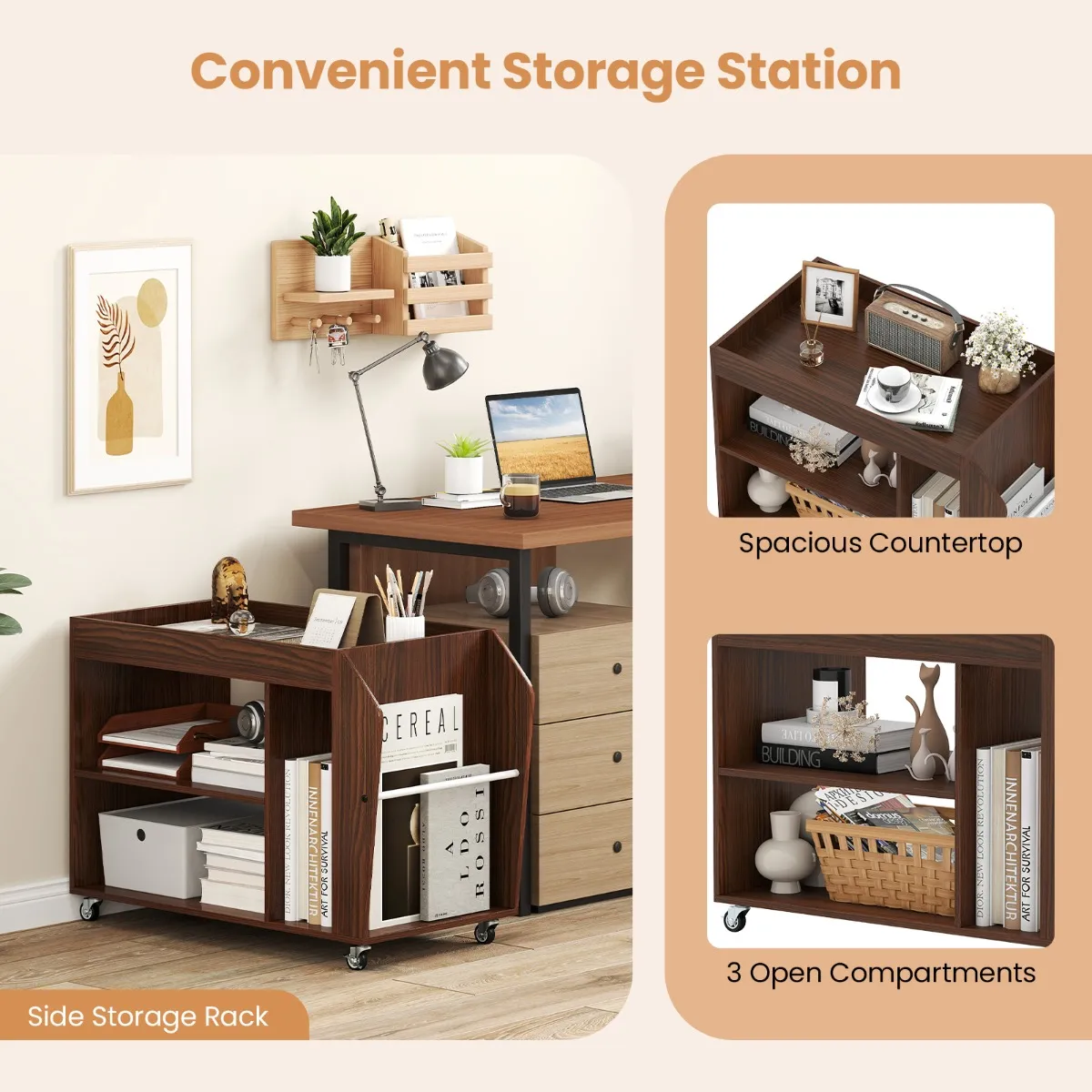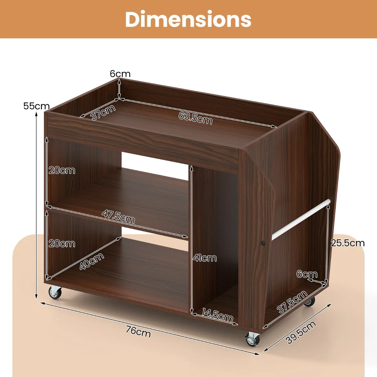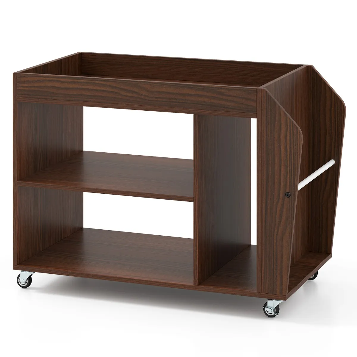 Met een ruim werkoppervlak, 3 vakken en praktische opbergruimte aan de zijkant is deze goed ontworpen rolbare bijzettafel een veelzijdige opbergoplossing. Hij is gemaakt van stevige houten planken en kan tot 55,5 kg dragen zonder aan stabiliteit in te boeten. Het heeft 4 zwenkwielen van 360°, waarvan er 2 vergrendeld kunnen worden, waardoor het gemakkelijk te verplaatsen is. Het kan worden gebruikt als nachtkastje, plank of trolley en heeft een bovenrail om te voorkomen dat voorwerpen vallen en schroefgatdeksels voor een elegante afwerking.