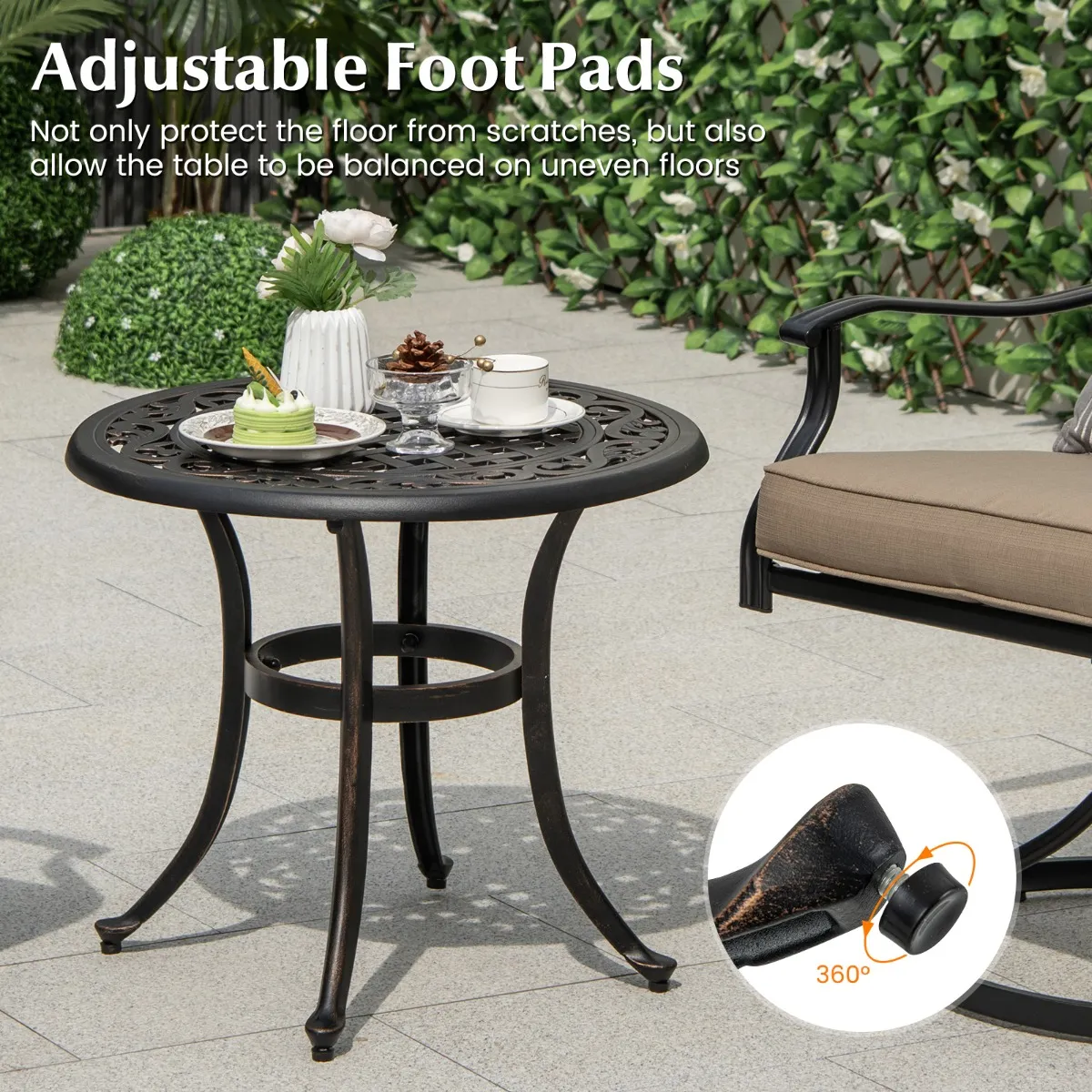 Onze tafel bestaat uit roestvrij en vervormingsbestendig gegoten aluminium en is zo ontworpen dat hij bestand is tegen de elementen en tegelijkertijd licht is, zodat hij gemakkelijk te vervoeren is. De versterkte houder en de verstelbare voetkussens zorgen voor een stabiele en wiebelvrije structuur. En de ingewikkelde patronen op het tafelblad en het antieke bruine oppervlak geven elke buitenruimte een retro charme. Deze compacte en toch functionele bijzettafel is perfect voor verschillende gelegenheden buitenshuis en is daardoor een veelzijdige en stijlvolle aanvulling voor achtertuinen, zwembaden en balkons.