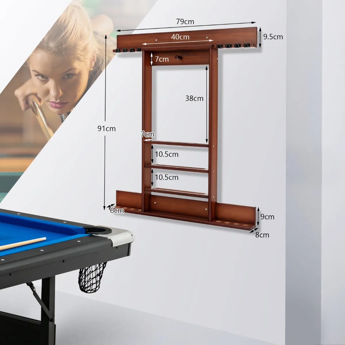 Hij beschikt over 8 clips voor 8 keues, 3-traps kogelhaas voor 15 biljartballen, pennen voor 1 ballabak en bovenste en onderste planken voor borstels of krijt, waardoor de beperkte ruimte optimaal wordt gebruikt. Bovendien is hij door zijn stijlvolle uiterlijk en zijn compacte formaat een echte blikvanger. Je kunt het gebruiken om je gasten te verheugen en familiefeesten te organiseren. Bovendien houden geselecteerde grenenhout en een solide frame het duurzaam en stabiel aan de muur. Je kunt pluggen en schroeven gebruiken om hem stevig aan de muur te bevestigen. Opmerking: keus, ballen, balstandaard, krijt, borstel en brugkop zijn niet inbegrepen.