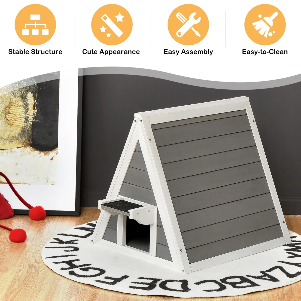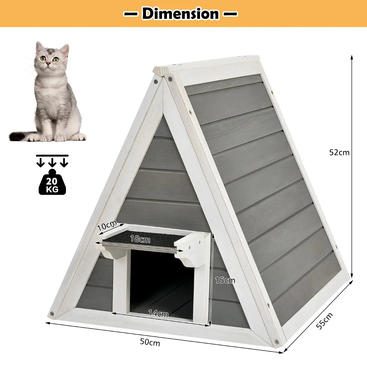 Ons driehoekig houten kattenhuis met een weerbestendig schuin asfaltdak is geschikt voor kittens, konijnen, honden, kippen en andere kleine dieren, die zich kunnen aanpassen aan verschillende weersomstandigheden en een langdurige duurzaamheid bieden. Gemaakt van 100% hoogwaardig dennenhout met een coating op waterbasis om een stevige en verdikte A-vormige structuur te vormen, garandeert het kattenhok een grote stevigheid en langdurig gebruik. Het driehoekige houten huisje is licht van gewicht, draagbaar en gemakkelijk op te zetten, wat moeite en tijd bespaart bij het dagelijkse onderhoud. Ontworpen met een schattige vorm en elegante grijze kleur, zal dit klassieke kattenkasteel een opvallende aanvulling zijn op uw tuin, achtertuin, veranda, of elk ander binnen interieur.