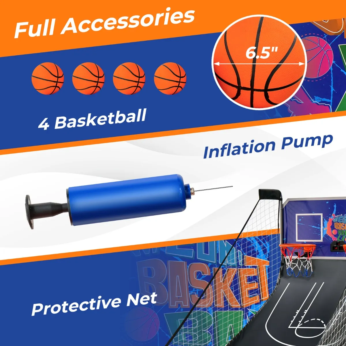 【Opvouwbare en duurzame ijzeren constructie】Het is eenvoudig op te vouwen door de grendelpen te verwijderen. Na het inklappen bespaart deze stevige ijzeren basketbal machine u veel tijd en geld. Samen met de speelhal geluiden zorgt het voor een spannende en competitieve sfeer, waardoor je een echte speelhal spel ervaring krijgt.