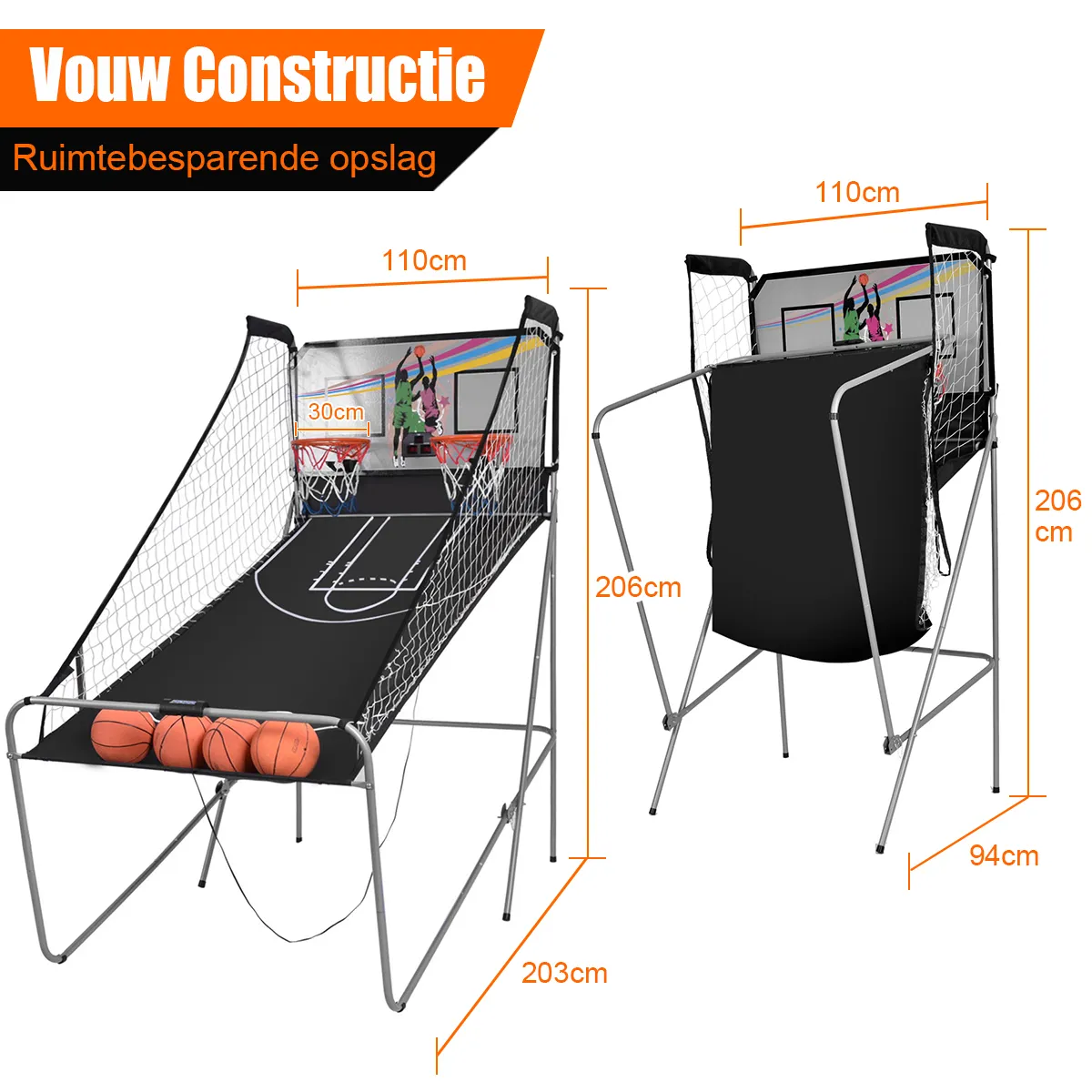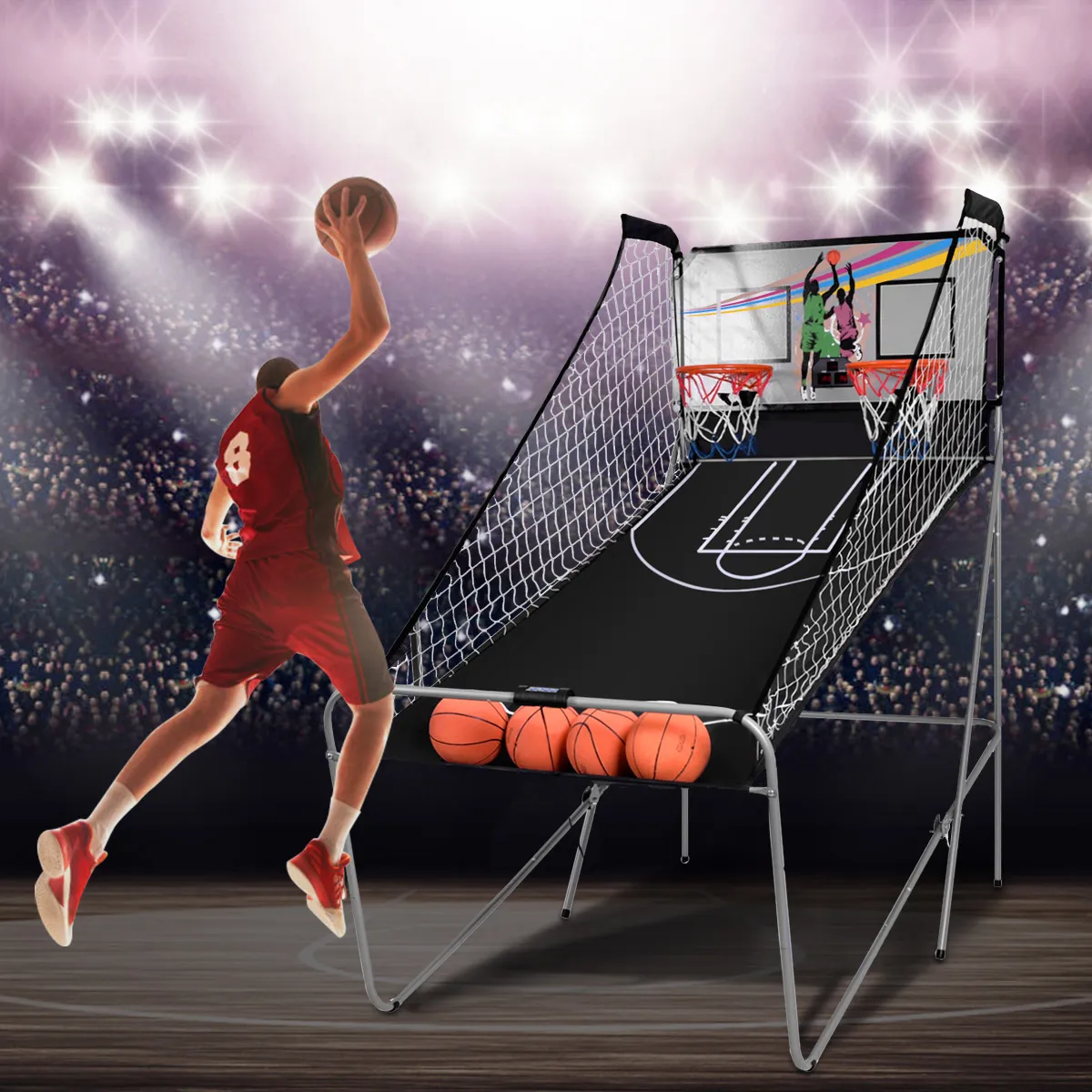 Een leuk spel dat u urenlang zal vermaken. Het wordt geleverd met 4 rubberen basketballen, twee hoepels en een elektronisch scorebord. Het heeft infrarood optische sensoren die zorgen voor een nauwkeurige en snelle score. Met buzzers en geluidseffecten creëert het een echte arcade-ervaring. Gemaakt van duurzaam gepoedercoat staal, dit item is duurzaam en stevig. Aarzel niet om het te kopen!