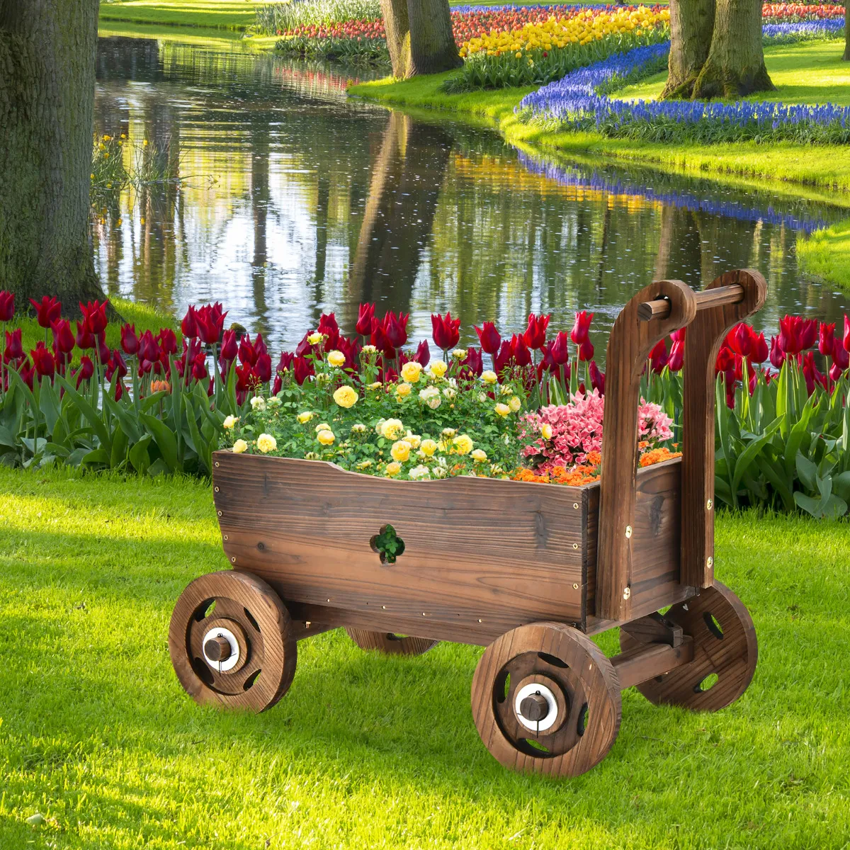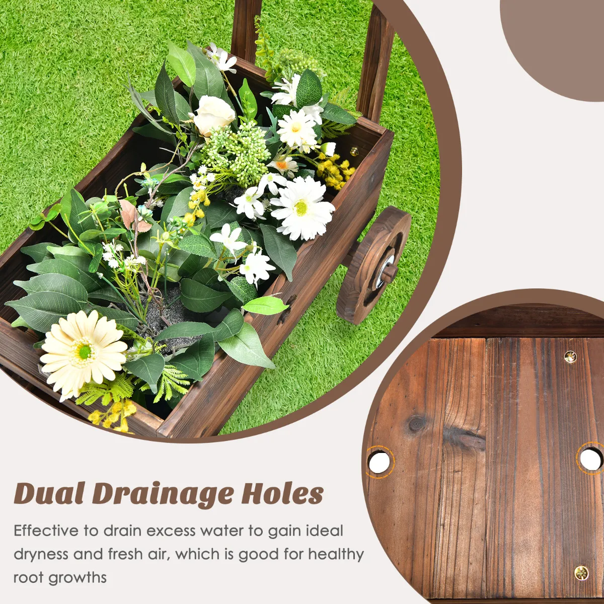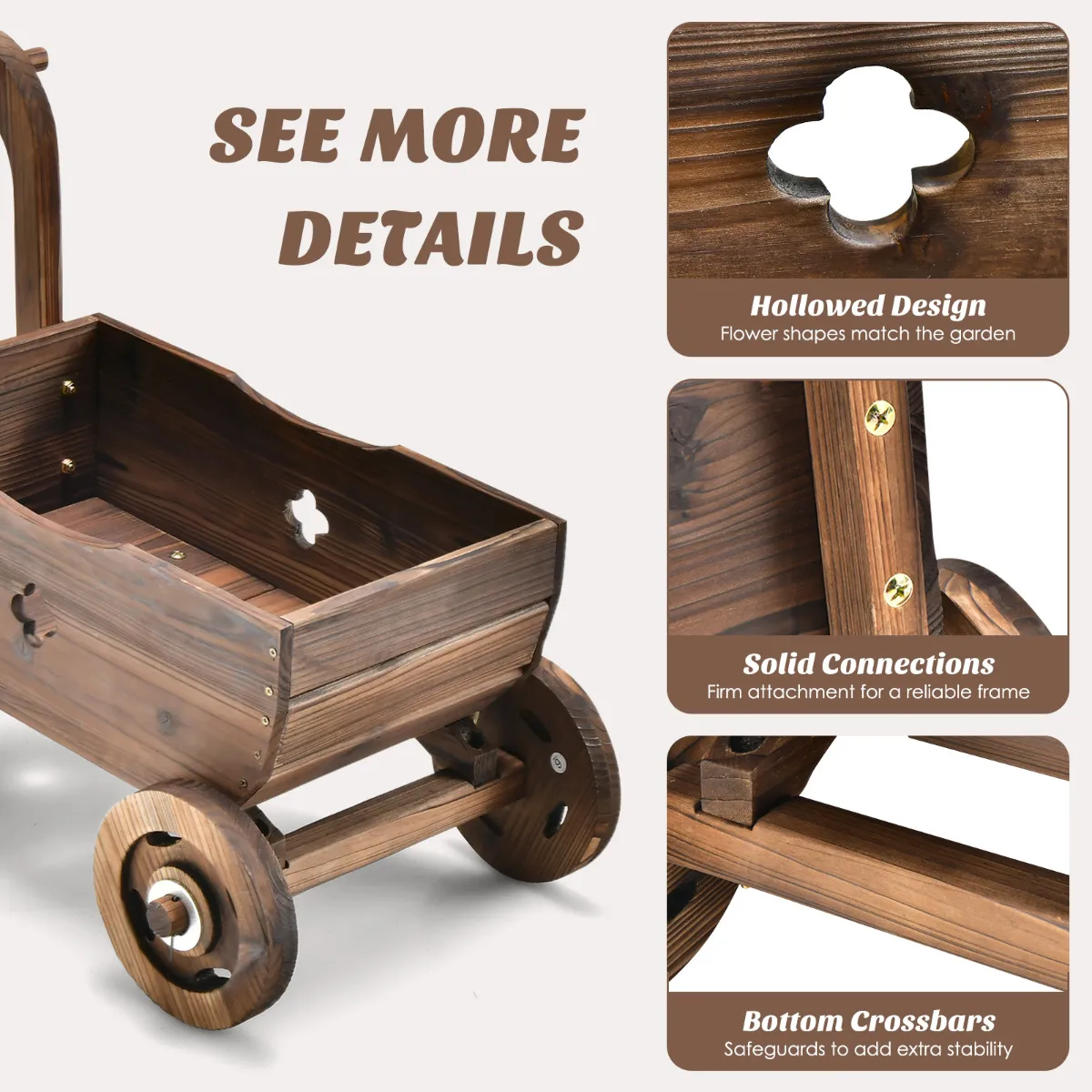Duurzaam en massief houten frame: De bloemenwagen is gemaakt van geselecteerd gecarboniseerd dennenhout, dat zeer sterk en weerbestendig is en een lange levensduur garandeert. En door hoge temperatuur carbonisatie zal het hout niet gemakkelijk scheuren of vervormen.