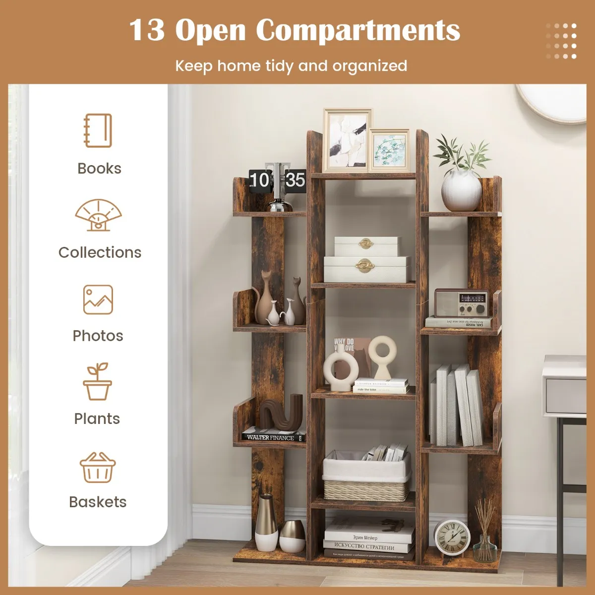 【Geavanceerde opbergruimte】: Met 13 verspringende planken biedt de vrijstaande boekenkast voldoende ruimte voor het presenteren en organiseren van boeken, verzamelingen, foto’s, planten en manden. Het open ontwerp en de juiste hoogte tussen de planken zorgen bovendien voor gemakkelijke toegang tot je artikelen.