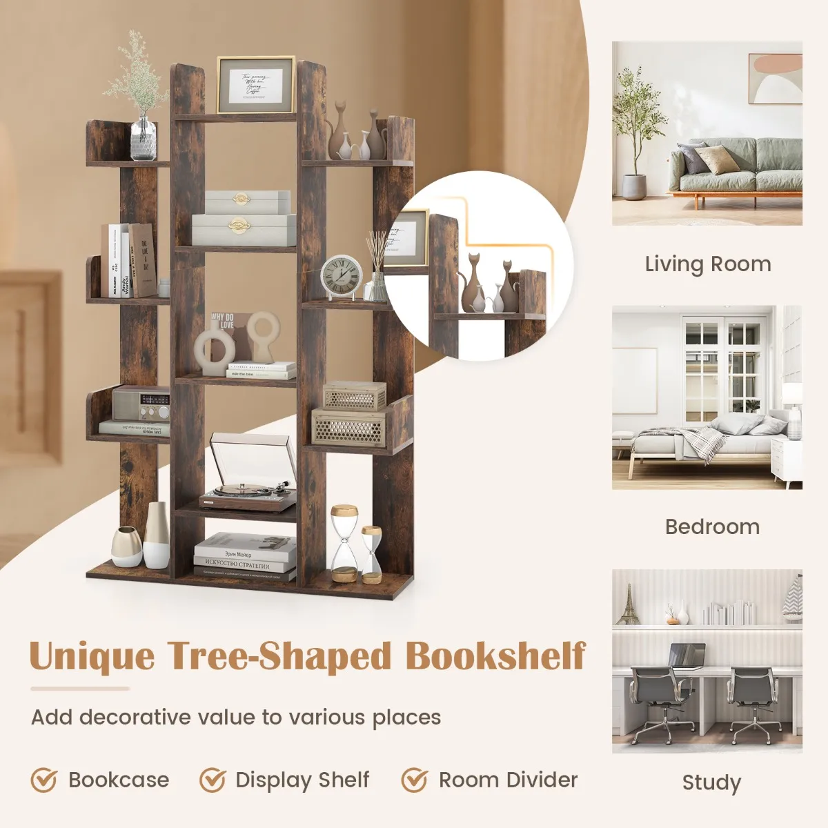 【Aantrekkelijk boekenkast in boomvorm】: Het door bomen geïnspireerde ontwerp geeft verschillende plaatsen een visueel aantrekkelijk element, of het nu als boekenkast, tentoonstellingsrek of ruimteverdeler is. De boekenkast past in elke hoek van je woonkamer, slaapkamer, werkkamer of kantoor en maximaliseert het gebruik van de ruimte.