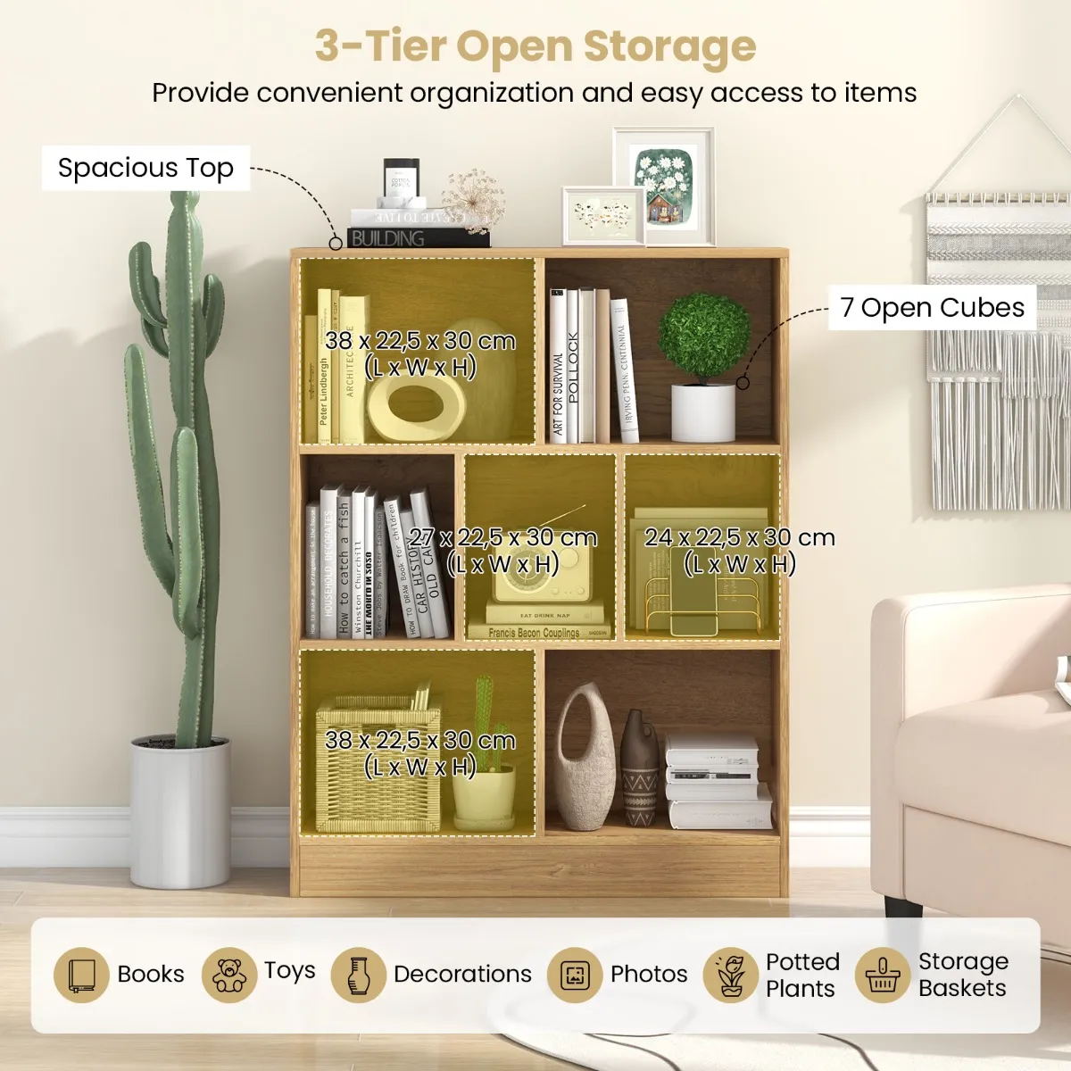 Onze boekenkast heeft 3 open opbergniveaus en een ruime bovenkant, waardoor er voldoende ruimte is om boeken en foto’s tentoon te stellen of verschillende persoonlijke spullen op te bergen. Hij is gemaakt van gefabriceerd hout en MDF, is uitzonderlijk duurzaam en robuust en kan tot 120 kg dragen. De anti-kantelsets en stabiele vloerbasis maken het ook veilig en betrouwbaar in gebruik. Dit veelzijdige houten meubel kan worden gebruikt als boekenkast, opbergrek of speelgoedkast, geschikt voor verschillende omgevingen.