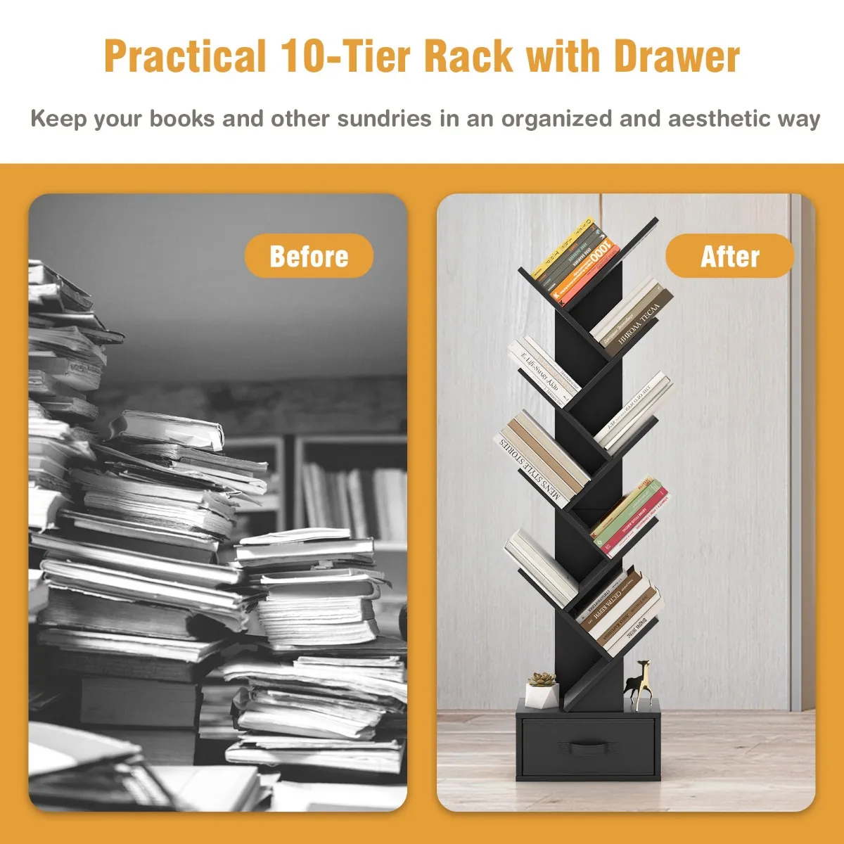 【Beste extra opbergruimte】: Met in totaal 10 open planken biedt de boom boekenkast verschillende aparte opbergruimtes waar je collecties kunt uitstallen. Bovendien heeft hij een stoffen lade voor persoonlijke opslag. Als u de lade verwijdert, heeft u nog een open plank aan de onderkant.