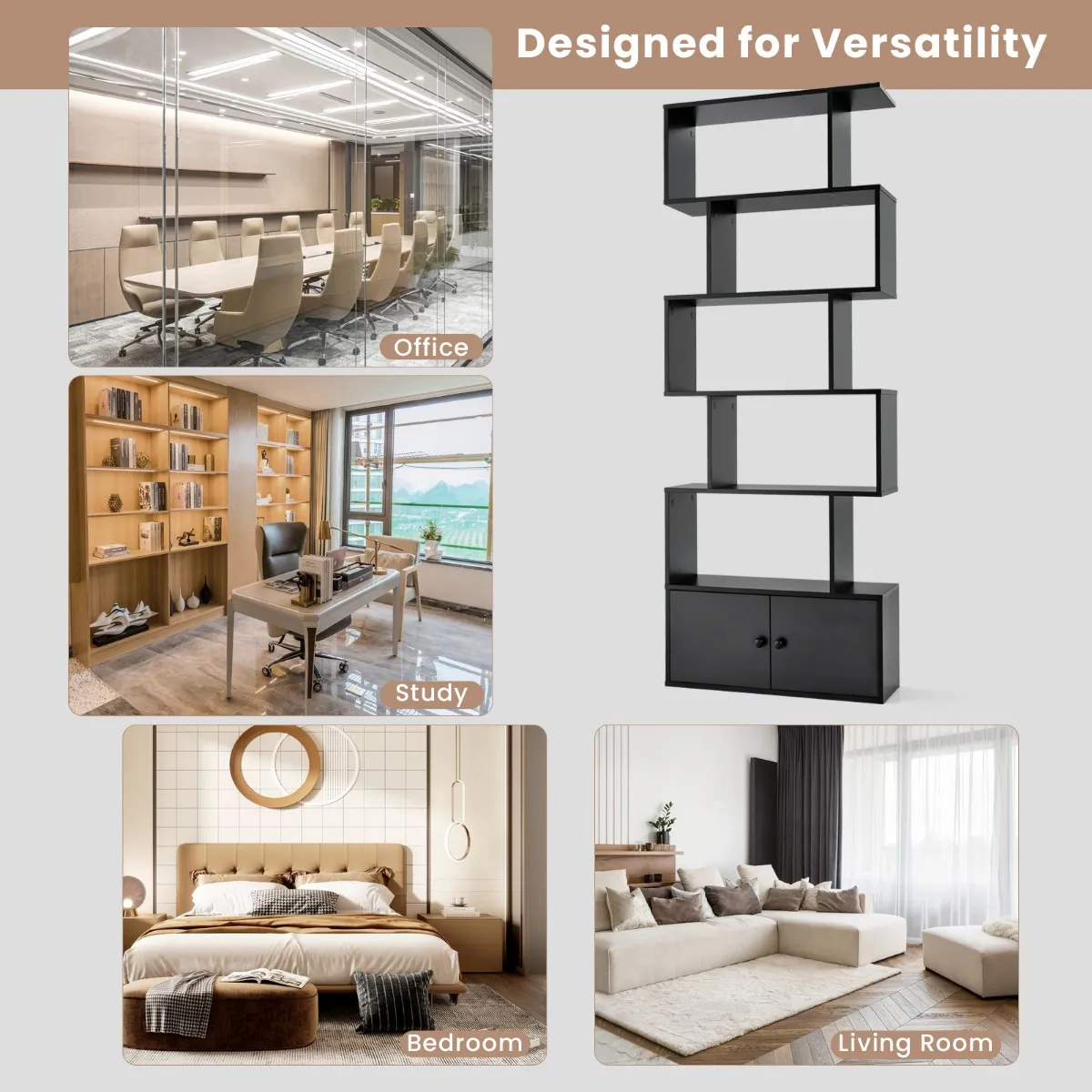 Boekenkast in geometrisch design: Met zijn S-vormige geometrische design is onze boekenkast niet alleen een functioneel opbergrek en tentoonstellingsrek, maar ook een opvallende decoratie in je kamer. De ruimteverdeler brengt meer artistieke stijlen in de kamer en is geschikt voor verschillende scenario’s zoals woonkamer, slaapkamer en thuiskantoor.