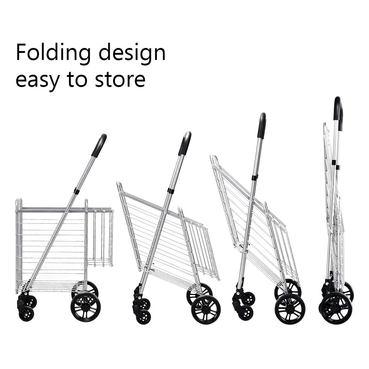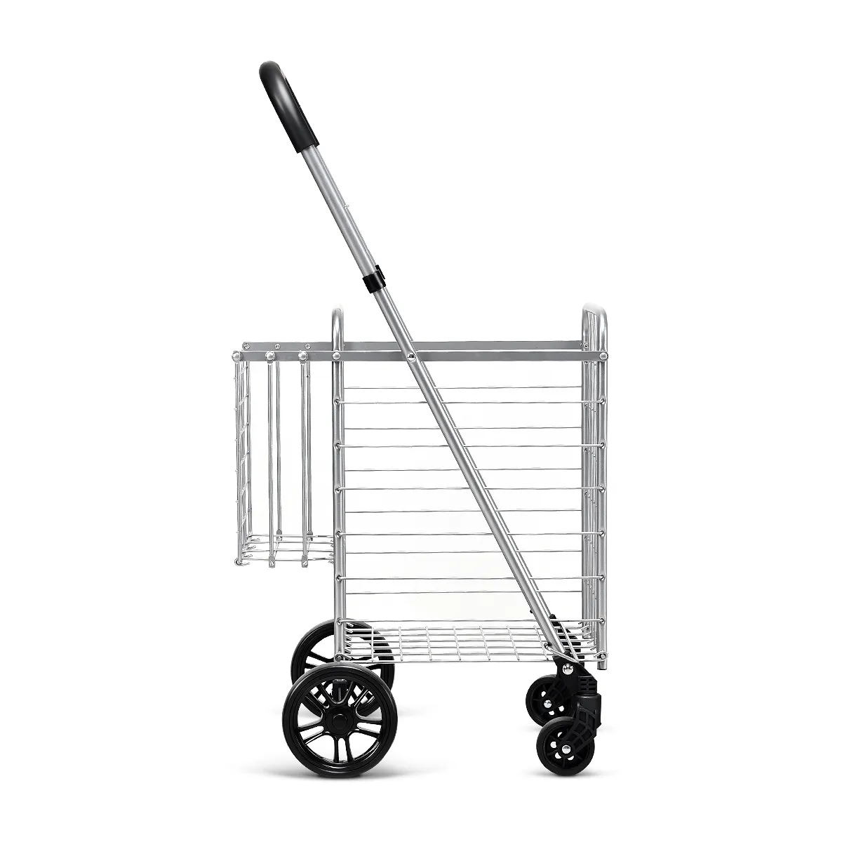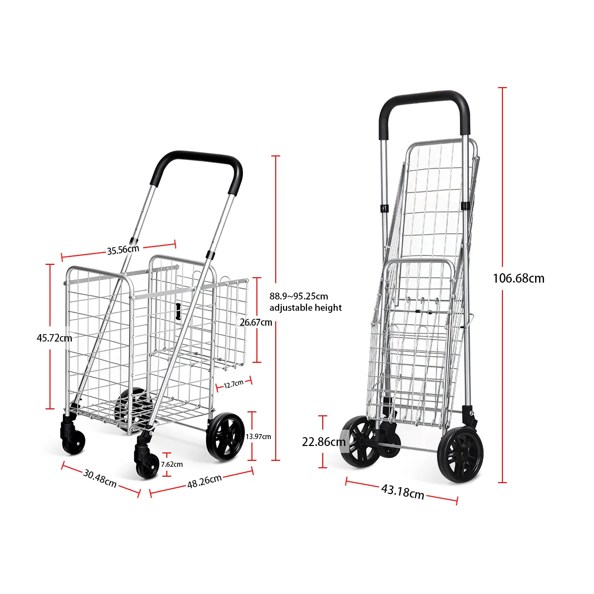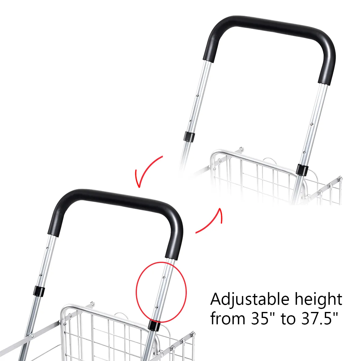 Dubbele mand: Deze winkelwagen bevat een basismand en een zijmand. En u kunt uw handtas, jas, paraplu en andere persoonlijke kleinere voorwerpen recht voor u houden, zodat u er gemakkelijk bij kunt en ze veilig kunt opbergen. Gebruik de tweede en grotere hoofdmand voor grotere, omvangrijkere lading.