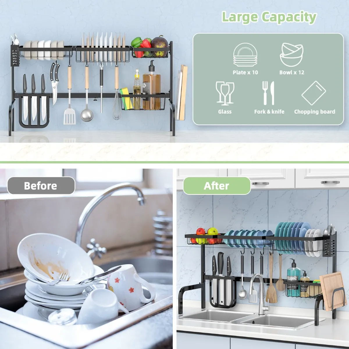 【Alles-in-een afdruiprek】: Inclusief 3 manden voor borden en kommen, een houder voor keukengerei, een snijplank houder, een afwasmiddel houder, een messenhouder en 8 haken. Dit twee laags afdruiprek is overvloedig in opslag en vrij in combinatie. Er kunnen minstens 12 kommen en 10 borden in worden opgeborgen, evenals ander keukentafereel.