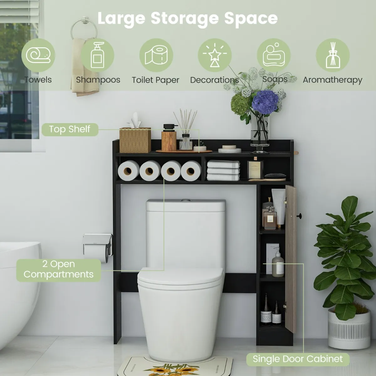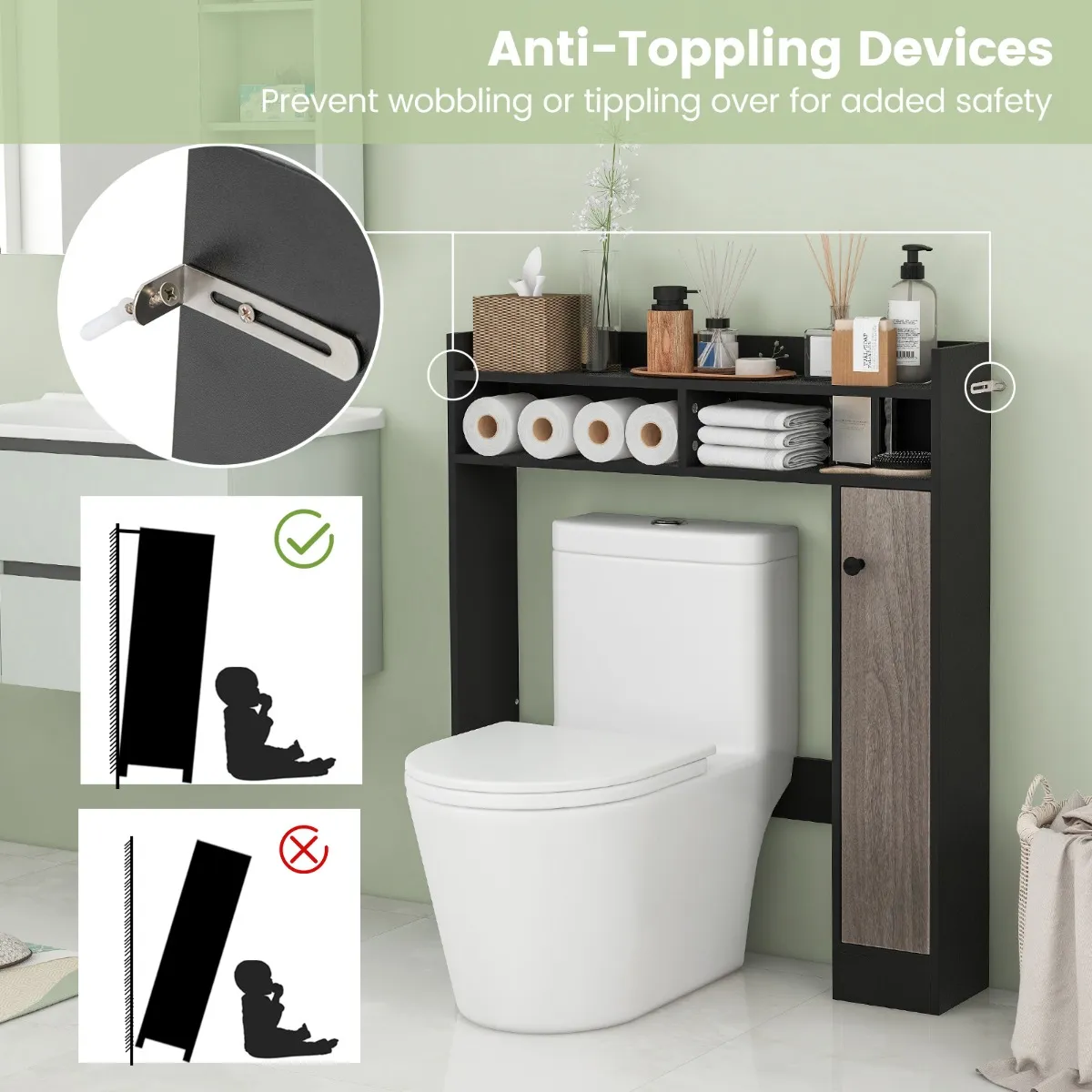 Met een bovenplank, 2 open vakken en een enkeldeurskast met 3 niveaus biedt dit vrijstaande toiletbovenkastje je veel opbergruimte zonder vloerruimte op te offeren. Bovenop dit alles zijn er 2 verstelbare planken in de zijkast, die 10 hoogtes hebben voor het opbergen van verschillende items van verschillende grootte. De onderste stang met 3 verstelbare hoogtes past zich aan verschillende toiletten aan. Bovendien hoef je je dankzij de kantelbeveiliging geen zorgen te maken over de stabiliteit van het toiletopbergmeubel. Met zijn strakke lijnen en moderne styling is deze opberger voor boven het toilet ook een stijlvol decoratief element voor je badkamer, bijkeuken, enz.