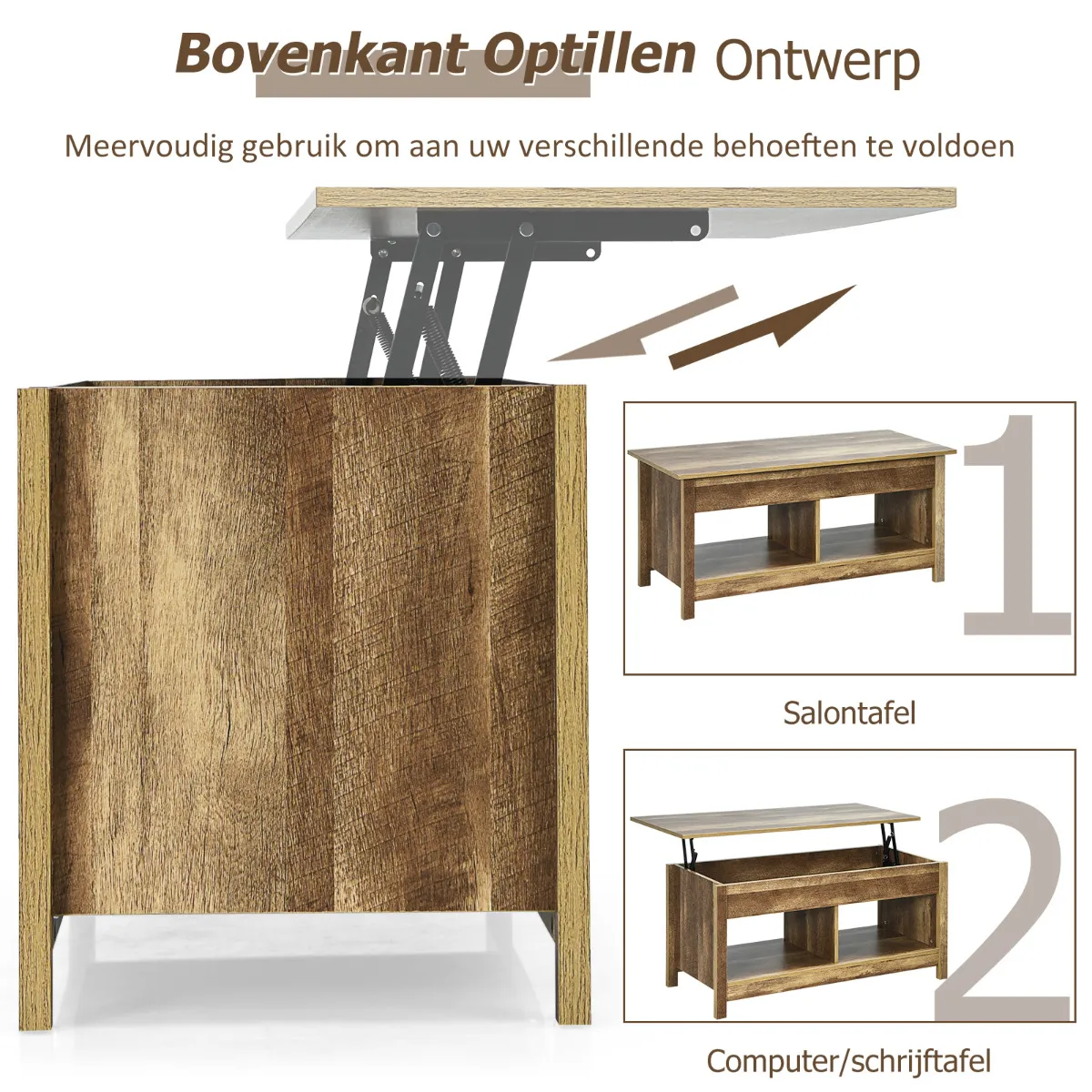 De salontafel is voorzien van open opbergplanken en verborgen vakken en biedt voldoende ruimte voor dagelijks gebruik terwijl u uw spullen netjes en op orde houdt. Een in hoogte verstelbaar oppervlak biedt de perfecte hoogte voor u wanneer u werkt of een kopje koffie drinkt. Het ontwerp met lifttop maakt ook gebruik van de beperkte ruimte en creëert een ideale werkruimte. Het houten blad en de massieve poten zorgen voor stabiliteit en duurzaamheid. Het eenvoudige maar verfijnde uiterlijk geeft u een gevoel van mode en past goed bij andere kamerdecoraties. Behalve als salontafel kan hij ook worden gebruikt als schrijftafel, werkplek in uw huis. Aarzel niet om hem mee naar huis te nemen!
