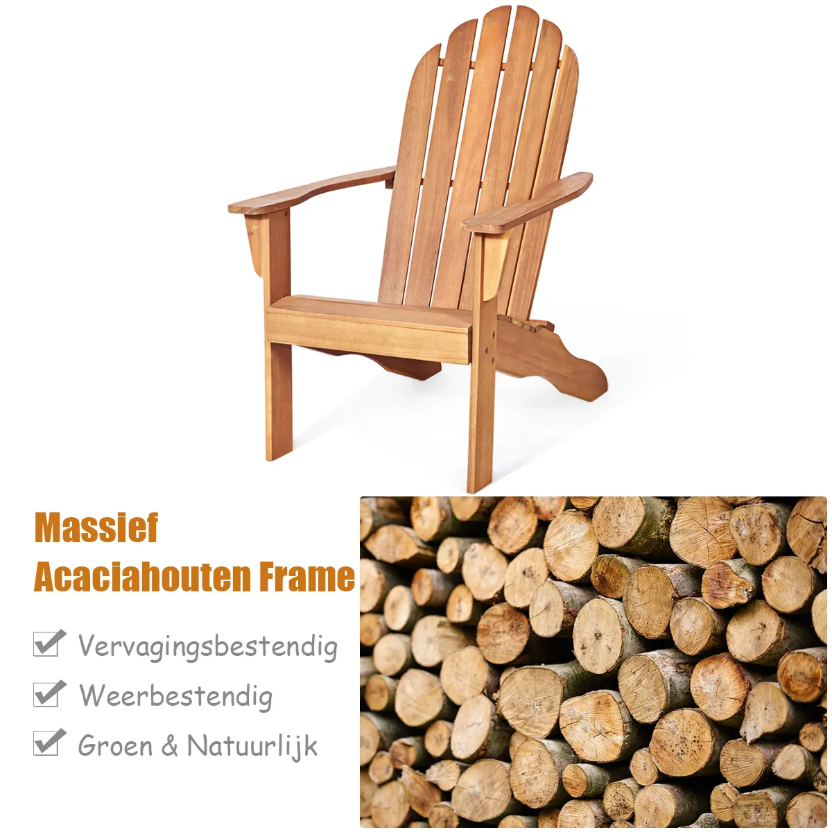 Dankzij het unieke karakter en de comfortabele zit is onze Adirondack stoel perfect voor op het terras, de achtertuin of de tuin. De Adirondack Chair is gemaakt van duurzaam acaciahout en gebruikt verzinkte schroeven en heeft een solide structuur en een hoog draagvermogen voor gebruik buitenshuis. Naast de stabiliteit is de stoel ook zeer comfortabel. Het combineert een ergonomisch ontwerp met een houten latten-look, waardoor het ademend is en je houding ondersteunt. Het klassieke ontwerp van de stoel past ook perfect bij uw bestaande inrichting en voegt een harmonieus, natuurlijk accent toe. Nu kunt u genieten van een betere en meer ontspannen tijd in uw tuin in deze Adirondack-stoel.