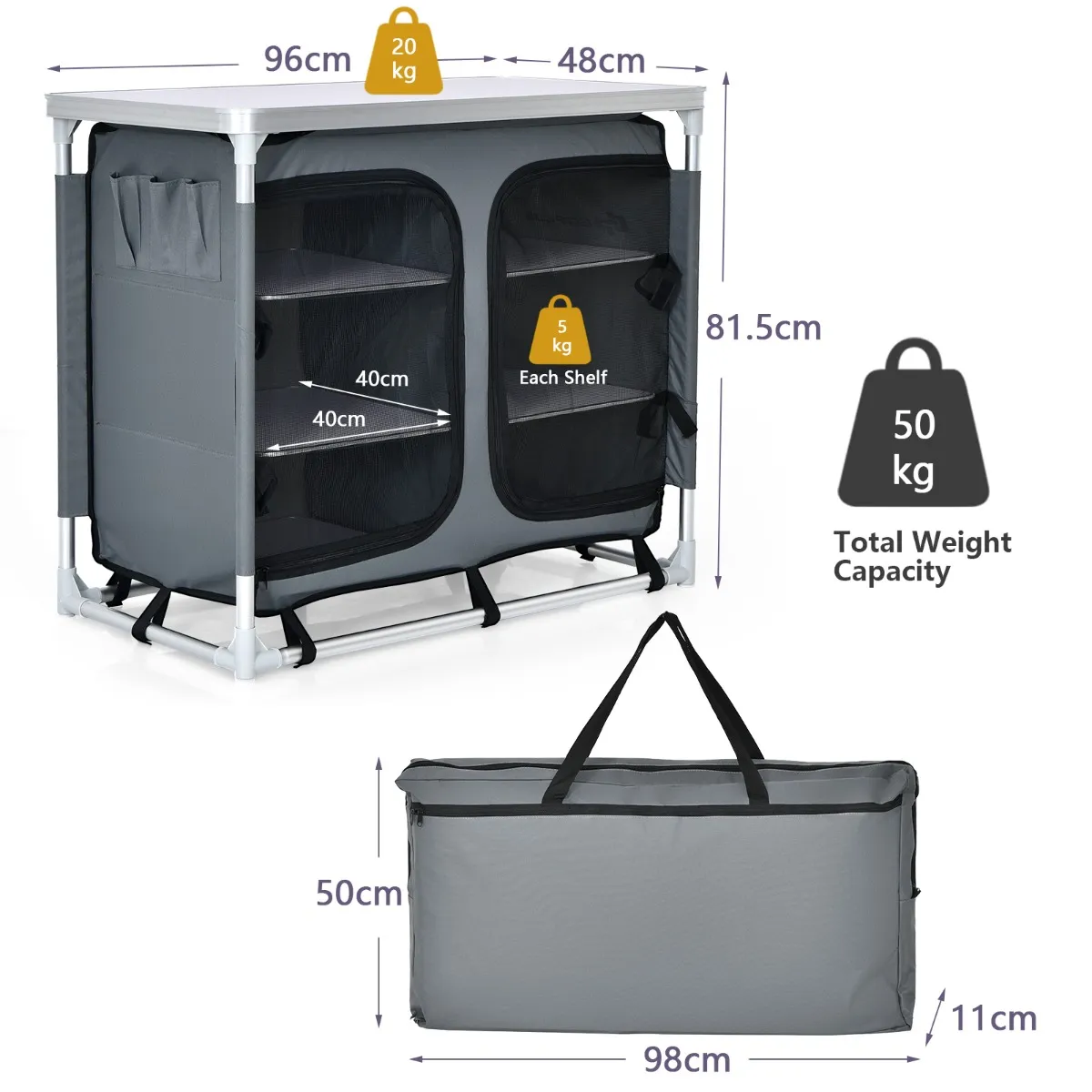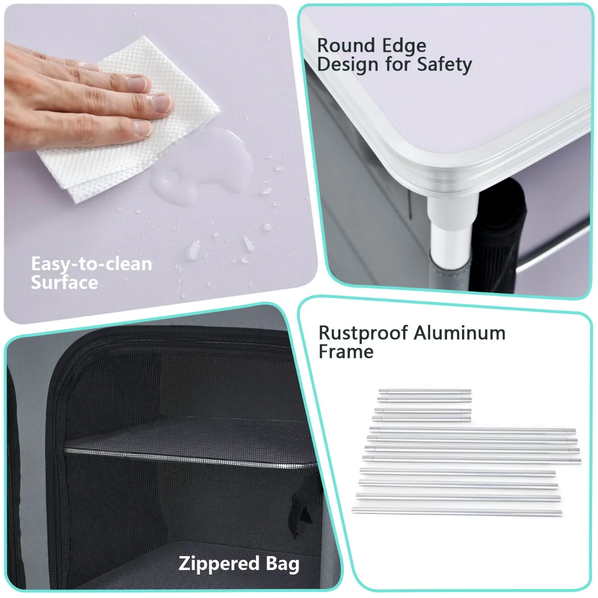 Uitgerust met 6 kubusvormige opbergruimte en een groot aanrecht, bezit deze draagbare grillplaat de grote opslagcapaciteit voor diverse specerijen en kookgerei. Gemaakt van een hoogwaardig stalen frame en oxford stof, is het keukentoestel stevig en duurzaam voor buitengebruik. Alle onderdelen zijn verpakt in de draagtas, perfect voor outdoor activiteiten zoals kamperen, lente-uitje, enz. Met de gedetailleerde gebruikershandleiding zult u ook geen moeite hebben met de montage van de grillplaat.