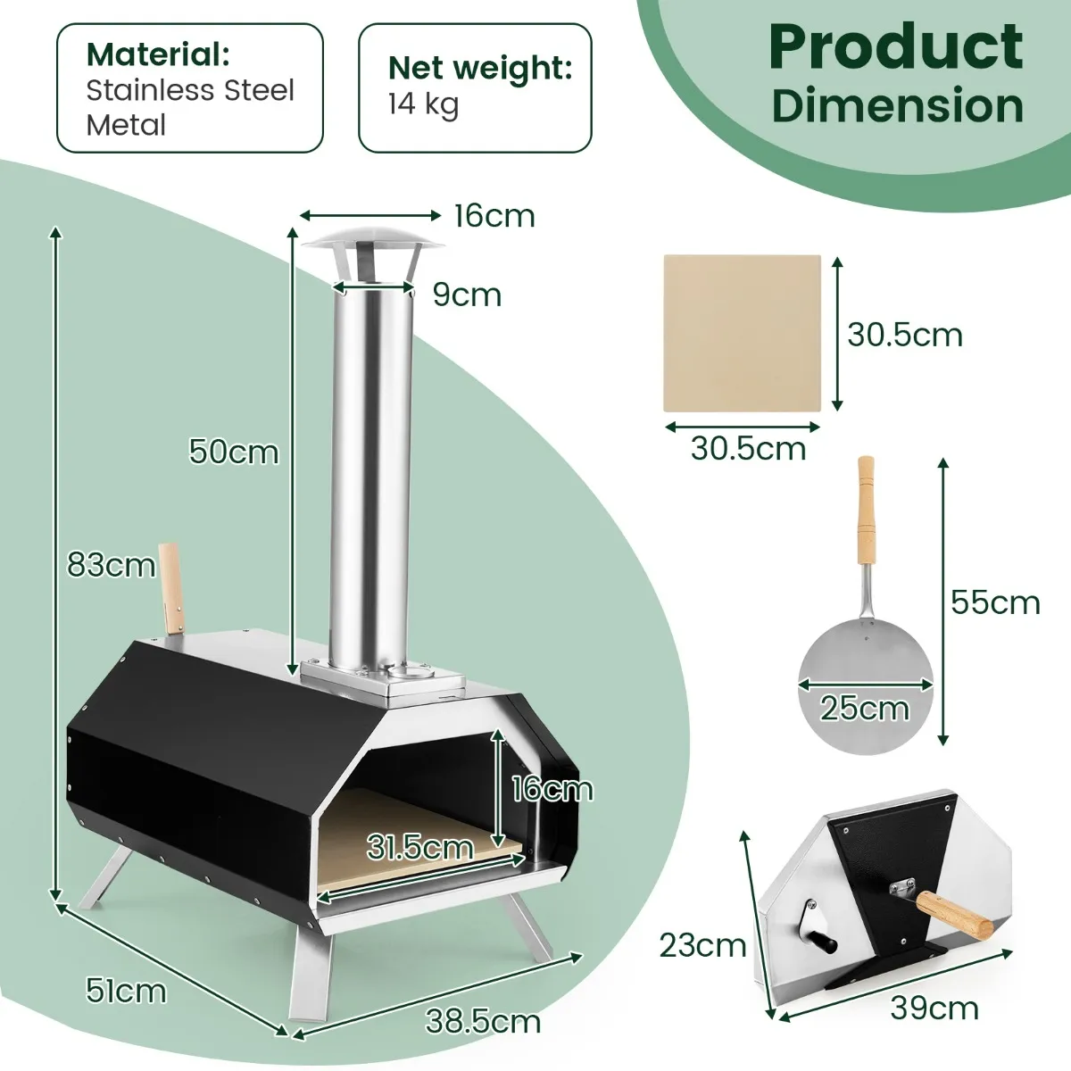 Eenvoudige installatie en onderhoud: De montage gebeurt eenvoudig en snel volgens gedetailleerde instructies. De pizzaoven is roestvrij en hittebestendig ontworpen. Na gebruik kun je de oven heel eenvoudig met een vochtige doek reinigen. Andere accessoires zoals cordieriet-pizzasteen, pizzaschuiver en afneembare ovendeur zijn ook inbegrepen.