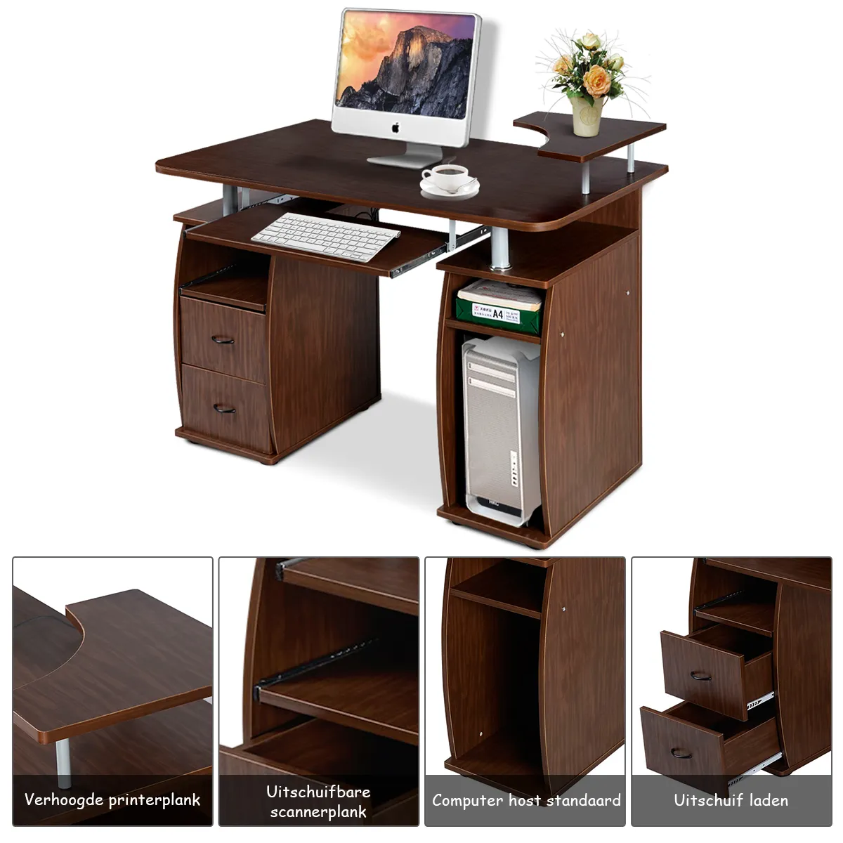 De computertafel biedt voldoende ruimte voor een computer, beeldscherm, printer en briefpapier en is tevens voorzien van een aparte toetsenbordlade.