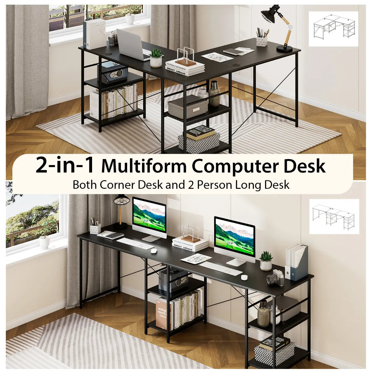 Werp een blik op deze converteerbare computertafel in L-vorm. Je kunt hem als L-vormig bureau monteren, dat comfortabel in de hoek past, of hem tot een 242 cm lang bureau voor 2 personen om samen te werken. Waar je ook voor kiest, het computerbureau biedt hetzelfde grote oppervlak voor je computermonitoren, toetsenborden, printers of ordners. Bovendien is er ook veel opbergruimte in de onderliggende planken, zodat je het essentiële binnen handbereik hebt zonder het tafelblad te overladen. Om het grote gewicht te dragen, is het bureaubureau gemaakt van hoogwaardige planken en robuuste metalen buizen. Mooi is ook dat het grote hoekbureau is uitgerust met verstelbare voetkussens om wiebelen tijdens het gebruik te voorkomen.