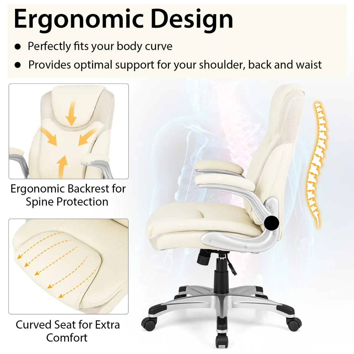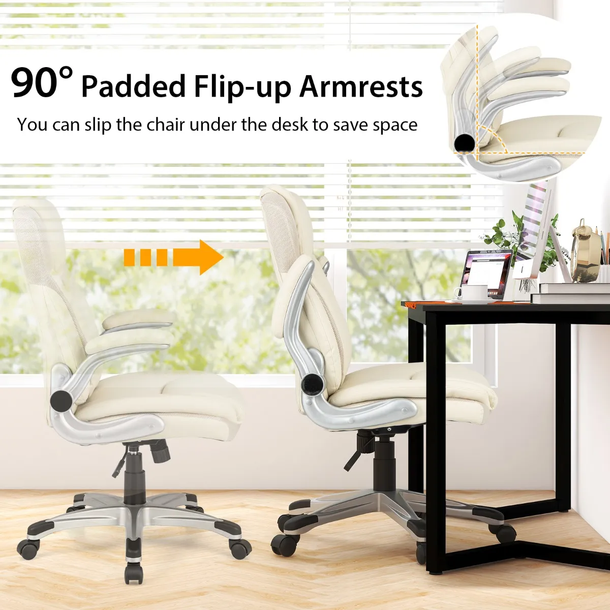 Het is tijd om te ontspannen en vermoeidheid te verminderen. De directiestoel beschikt over een draaibare rugleuning met ergonomisch design om vermoeidheid van de rug te verminderen. Dankzij de in hoogte verstelbare en draaibare zitting biedt de bureaustoel verschillende gebruikers meer comfort en ontspanning. Voor comfortabele bediening is er onder de zitting een schommelspanningsregeling (vast en los) en een hendel (op en neer). Bovendien is de draaistoel gevuld met zeer elastisch schuim en bekleed met huidvriendelijk PU-leer en biedt hij je een aangenaam zitgevoel. Uitgerust met opklapbare armleuningen kun je de stoel ruimtebesparend onder het bureau schuiven. Voor grote mobiliteit en comfortabel gebruik zorgen de soepel lopende wielen voor een stillere en eenvoudigere beweging op elke gewenste plaats.
