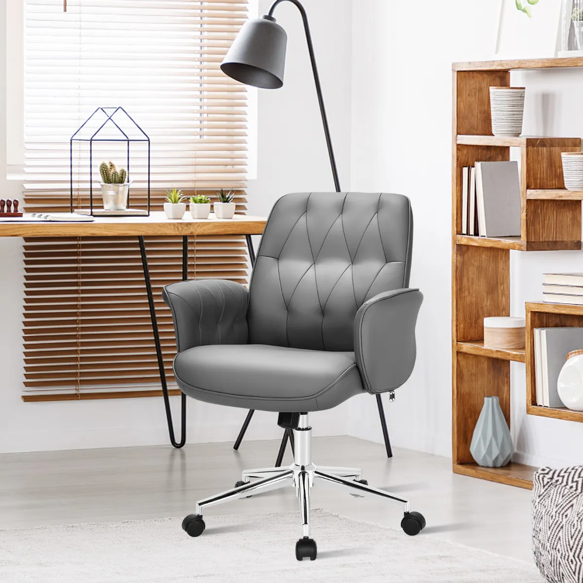 Deze bureaustoel van grijs leer is niet alleen stijlvol, maar ook zeer robuust en comfortabel. Door een robuuste metalen basis en een massieve verzinkte gasstaaf zorgt deze thuisbureaustoel voor uitstekende stabiliteit en kan hij tot 136 kg dragen. De ergonomische rugleuning past zich perfect aan de lichaamscurve aan voor optimaal comfort. De zitting en de armleuningen zijn gevoerd met dik schuim en bieden je een super comfortabele zitervaring. Bovendien is het gladde en waterdichte kunstleer gemakkelijk te reinigen en voelt het zacht aan.