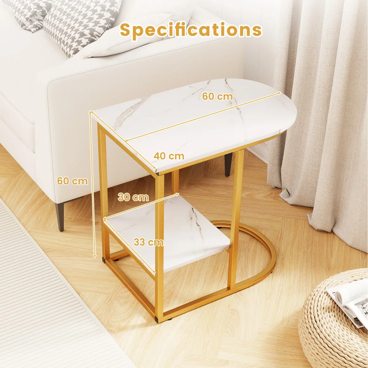 【Perfecte ‘C’-vorm voor elke ruimte】: Ontworpen met een stijlvolle ‘C’-vorm, past deze bijzettafel moeiteloos naast banken, bedden of andere kleine ruimtes, waardoor het de ultieme ruimtebesparende oplossing is. De afmetingen zijn 60 x 40 x 60 cm (L x B x H) en het lage onderstel van 2,5 cm maximaliseert de functionaliteit zonder stijl op te offeren.