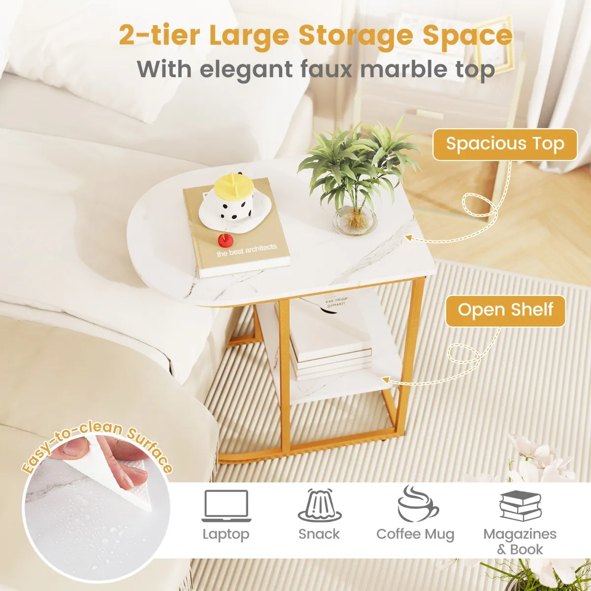 Deze C-vormige bijzettafel is perfect voor kleinere ruimtes en is een ruimtebesparende oplossing. Profiteer van de dubbele functionaliteit dankzij het ontwerp met twee niveaus: perfect voor het plaatsen van je drankjes en het opbergen van je favoriete boeken. Geniet van de weelderige elegantie van imitatiemarmer, dat elk interieur verfraait, van modern minimalistisch tot klassiek charmant. Hij is gebouwd om lang mee te gaan met een stevig metalen frame en stabiele, verstelbare glijders, en is daardoor stabiel. Dankzij het gemakkelijk schoon te maken oppervlak blijft hij er met minimale inspanning piekfijn uitzien.