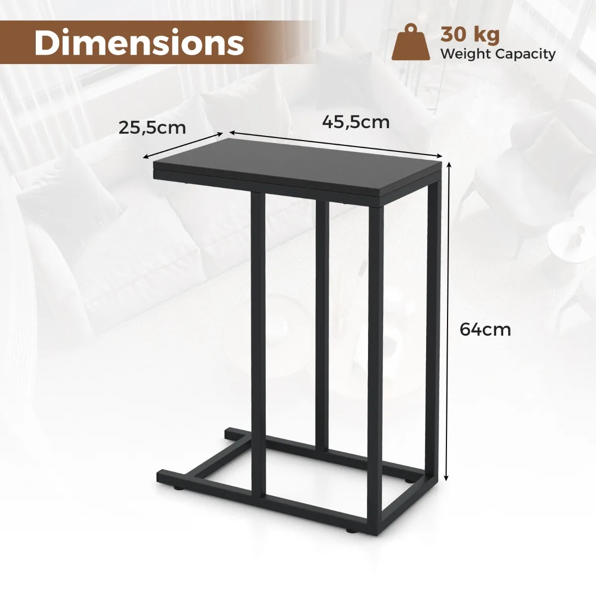 Door het ‘C’-vormige ontwerp van onze bijzettafel schuif je hem gemakkelijk onder banken en bedden. Dankzij de ruime bovenkant en stevige constructie biedt hij stevige ondersteuning voor een laptop, een kopje koffie of snacks. Hij zit op een optimale hoogte van 64 cm en sluit perfect aan op armhoogte voor comfort. Of je hem nu gebruikt als bijzettafel, tv-blad of compacte werkruimte, hij is een geweldige aanvulling op je woon- of slaapkamer.