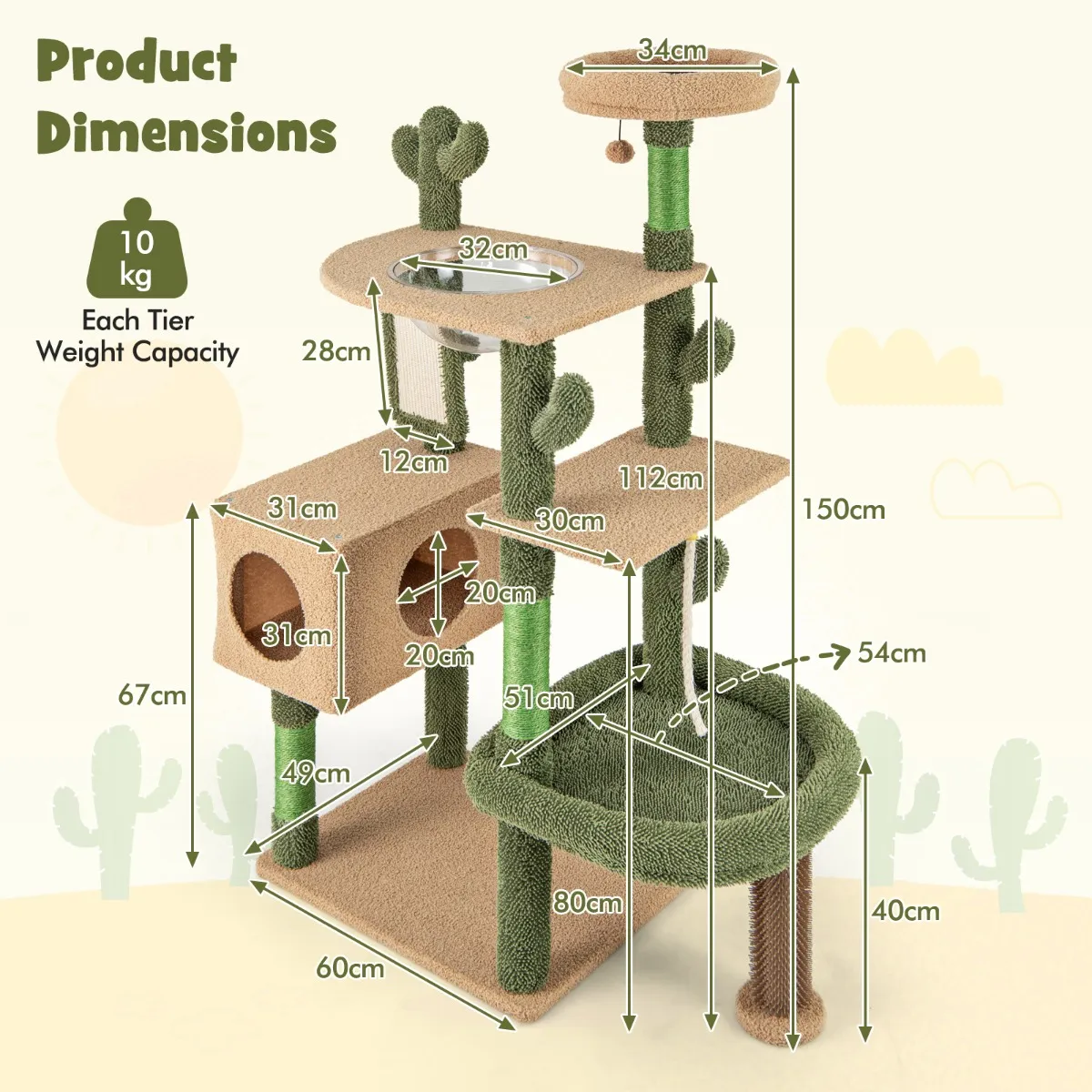 Met een zelfreinigende borstel, 2 zitstokken, een ruime condo, pluche pom-pom, transparante schotel, krabpalen en sisaltouw, biedt deze mooie kattentoren je kat veel activiteiten. Hij is 150 cm hoog, heeft een anti-kantelset en een bredere basis voor extra veiligheid. Hij is bekleed met pluisvrije fleece en dweilstof, waardoor een gezellig toevluchtsoord ontstaat. Dit indoor kattenspeelcentrum met zijn cactusvormige palen geeft een charmant en kleurrijk tintje aan je interieur.