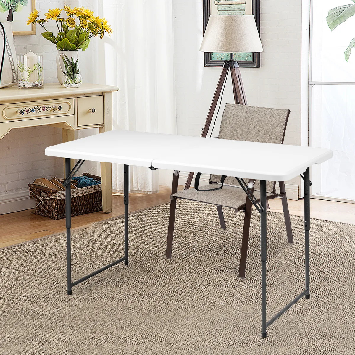 Opvouwbaar ontwerp voor gemakkelijk dragen en opbergen: er is geen montage vereist. Na het uitklappen is de tafel beschikbaar. Dankzij het compacte formaat neemt de tafel in opgevouwen toestand weinig ruimte in beslag. Met de draagbeugel is hij gemakkelijk te vervoeren.