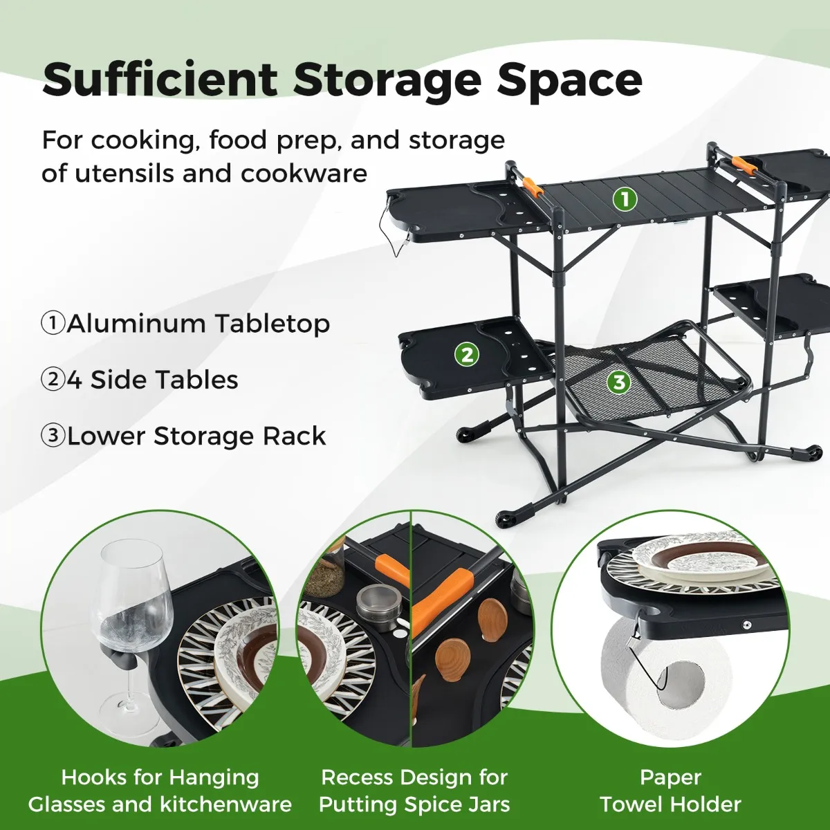 Voldoende opbergruimte:Â Deze campingkeukentafel is handig ontworpen met een oprolbaar aluminium tafelblad om te koken, 4 uitklapbare zijtafels voor extra ruimte en een opbergvak aan de onderkant voor keukengerei en benodigdheden. Er zijn ook haken om potten op te hangen, een uitsparing voor het plaatsen van kruidenpotjes en een houder voor papieren handdoeken.
