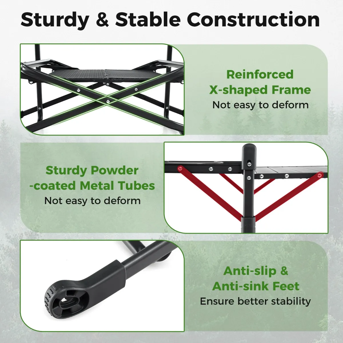 Stevige en stabiele constructie: Deze campingkeukentafel is ontworpen voor gebruik buitenshuis. Hij is gemaakt van stevige, gepoedercoate metalen buizen en is versterkt met X-vormige frames voor extra stabiliteit, terwijl de antislip- en zinkvrije voetjes de tafel veilig op zijn plaats houden op verschillende oppervlakken.