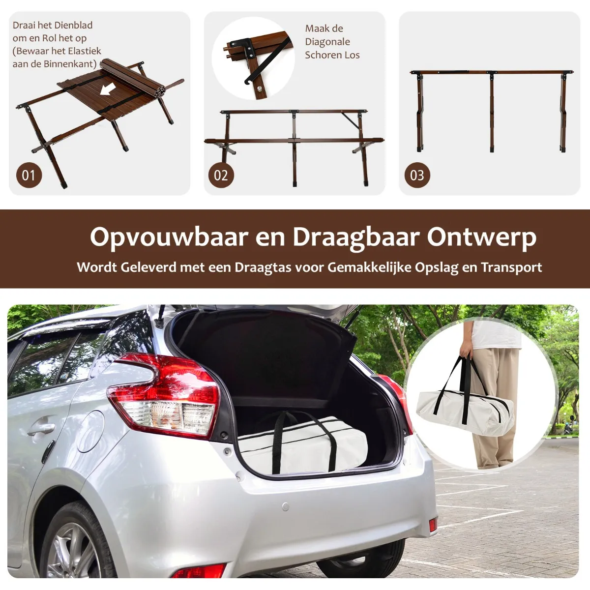 De opvouwbare campingtafel kan worden opgeborgen in de draagbare en verlichte draagtas