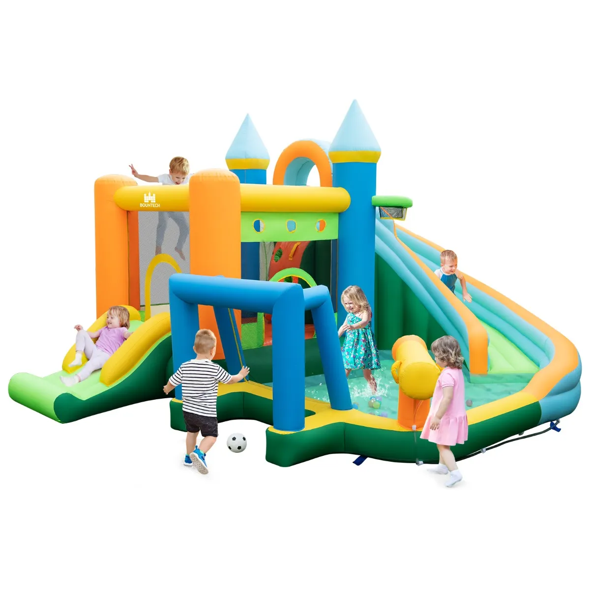 Dit waterspeelcentrum biedt spannende spellen zoals basketbal en voetbal, maar ook 50 oceaanballen. Met 2 glijbanen, een klimmuur en een springmat kunnen kinderen actief blijven en hun behendigheid op de proef stellen. Het pierenbad en waterkanon zijn verfrissend en stimuleren interactief spel. Gemaakt van Oxford stof met PVC-coating en gaas, garandeert het langdurig speelplezier voor kinderen van 3 tot 10 jaar, met een gewichtslimiet van 90 kg voor de opblaasbare onderdelen. Het is eenvoudig te installeren en bevat alle benodigde accessoires.