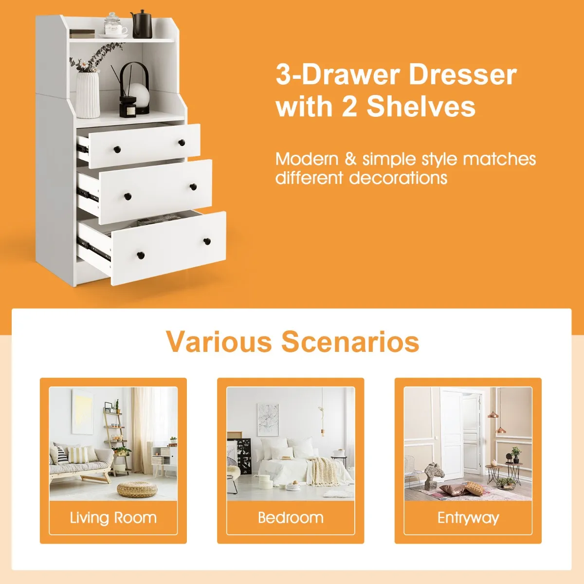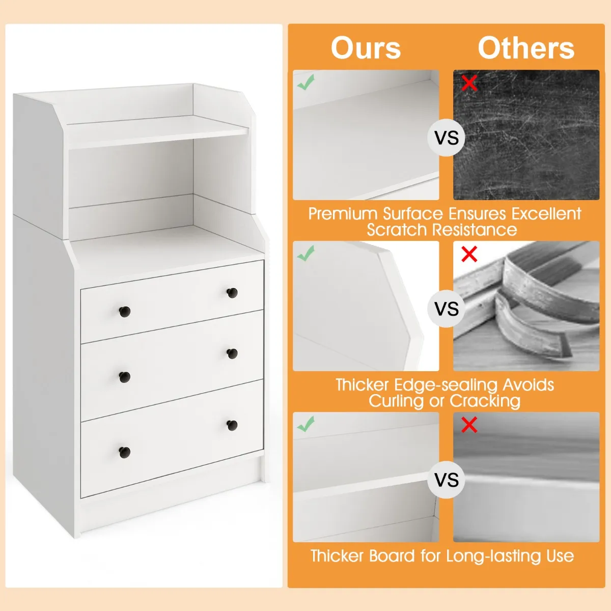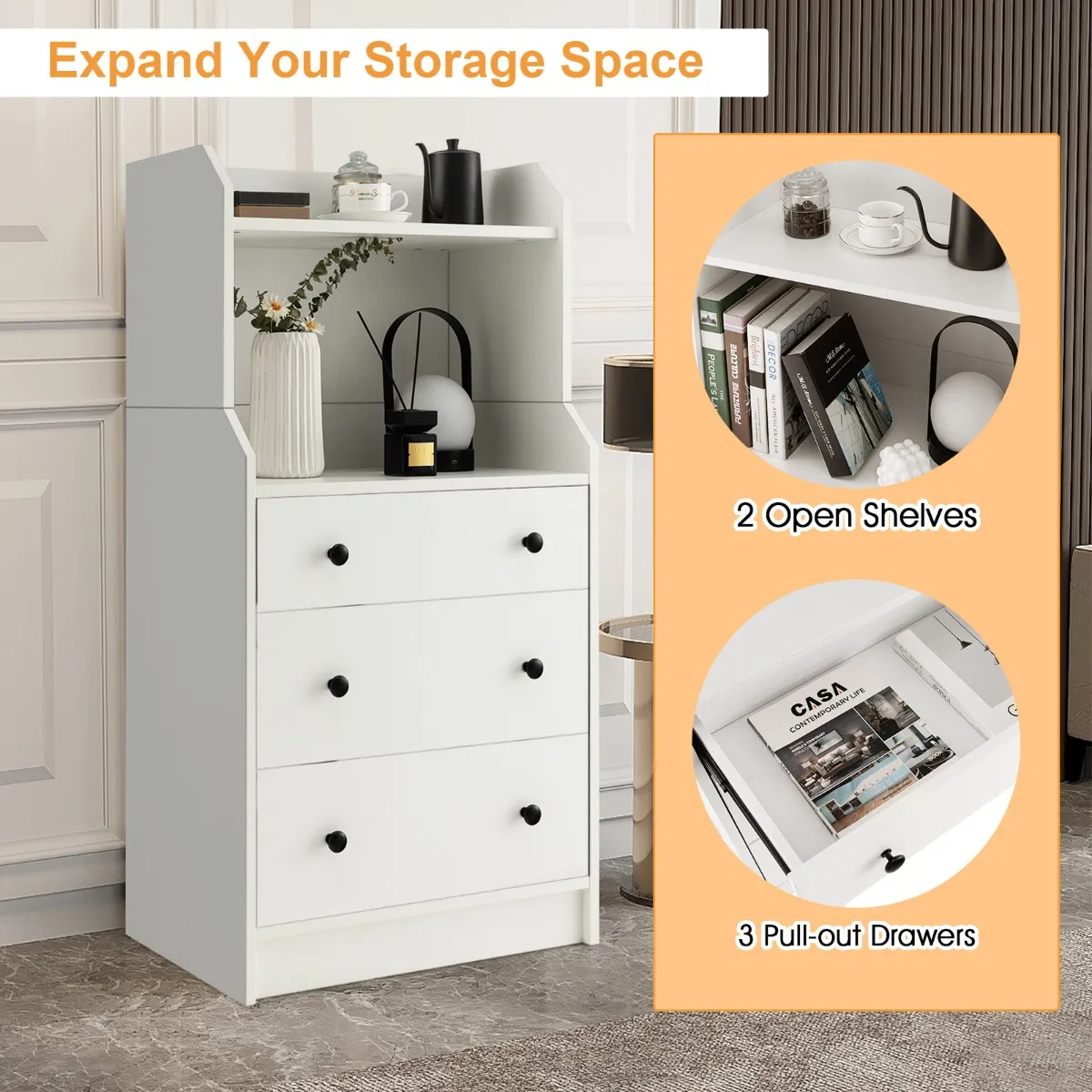 【Open en gesloten opbergruimte】: Met 3 uittrekbare laden biedt de commode veelzijdige opbergmogelijkheden voor kleding, boeken, speelgoed, snacks en decoratieve voorwerpen. Als alternatief kun je op het 2-traps open rek je geliefde decoraties neerzetten en ze overzichtelijk en gemakkelijk toegankelijk opbergen.