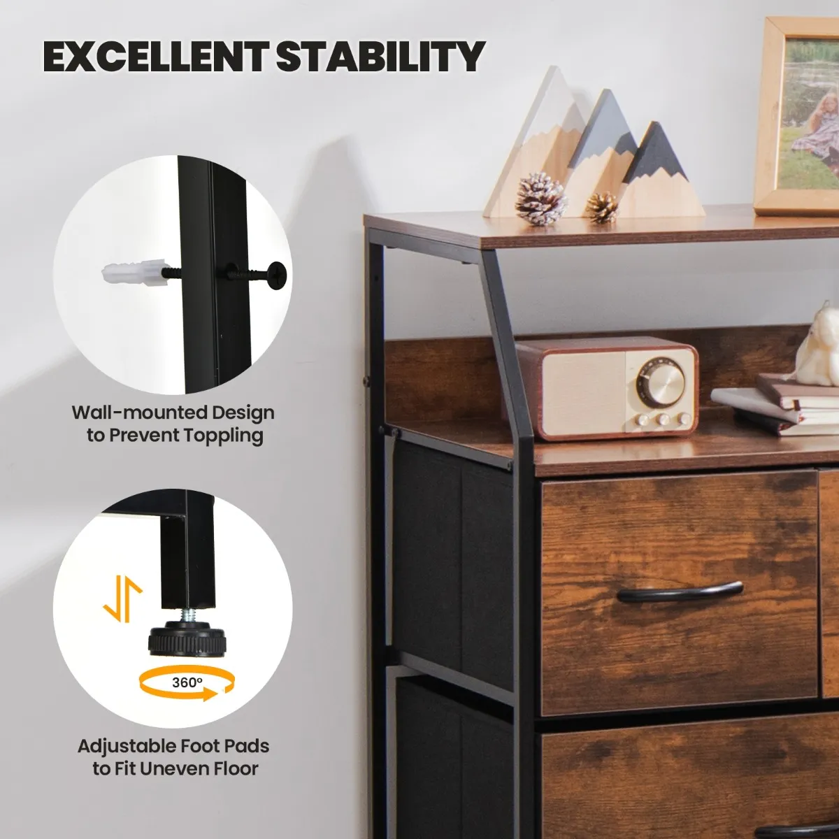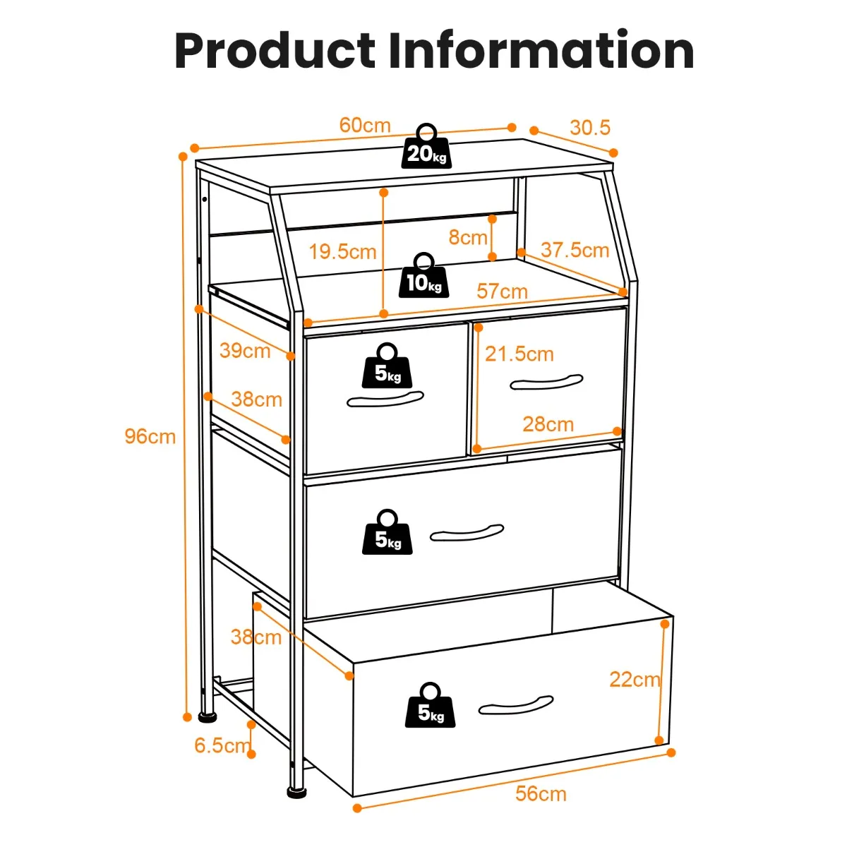De stoffen commode met 4 lades biedt veel opbergruimte om je kamer te organiseren. De plank met 2 verdiepingen is perfect voor decoraties, terwijl de 4 uittrekbare laden met handgrepen rommel uit het zicht houden. De middelste plank heeft een rugpaneel om te voorkomen dat spullen eruit vallen. En om te voorkomen dat de commode omvalt, kun je de meegeleverde uitzetschroeven gebruiken voor extra steun. Het stevige metalen frame is stabiel en biedt voldoende draagkracht. En er zijn verstelbare voetsteunen voor extra stabiliteit.