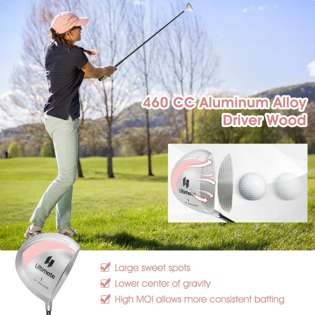 Complete golfclubset voor dames: deze 9-delige golfclubset bevat 1# driver met rackethoofdhoes, 3# Fairway met racketkap, 4# hybride met racketkap, 6 ijzer, 7 ijzer, 8 ijzer, 9-delig ijzer, P#-ijzer en putter. Het is geschikt voor rechtshandige vrouwelijke golfers.