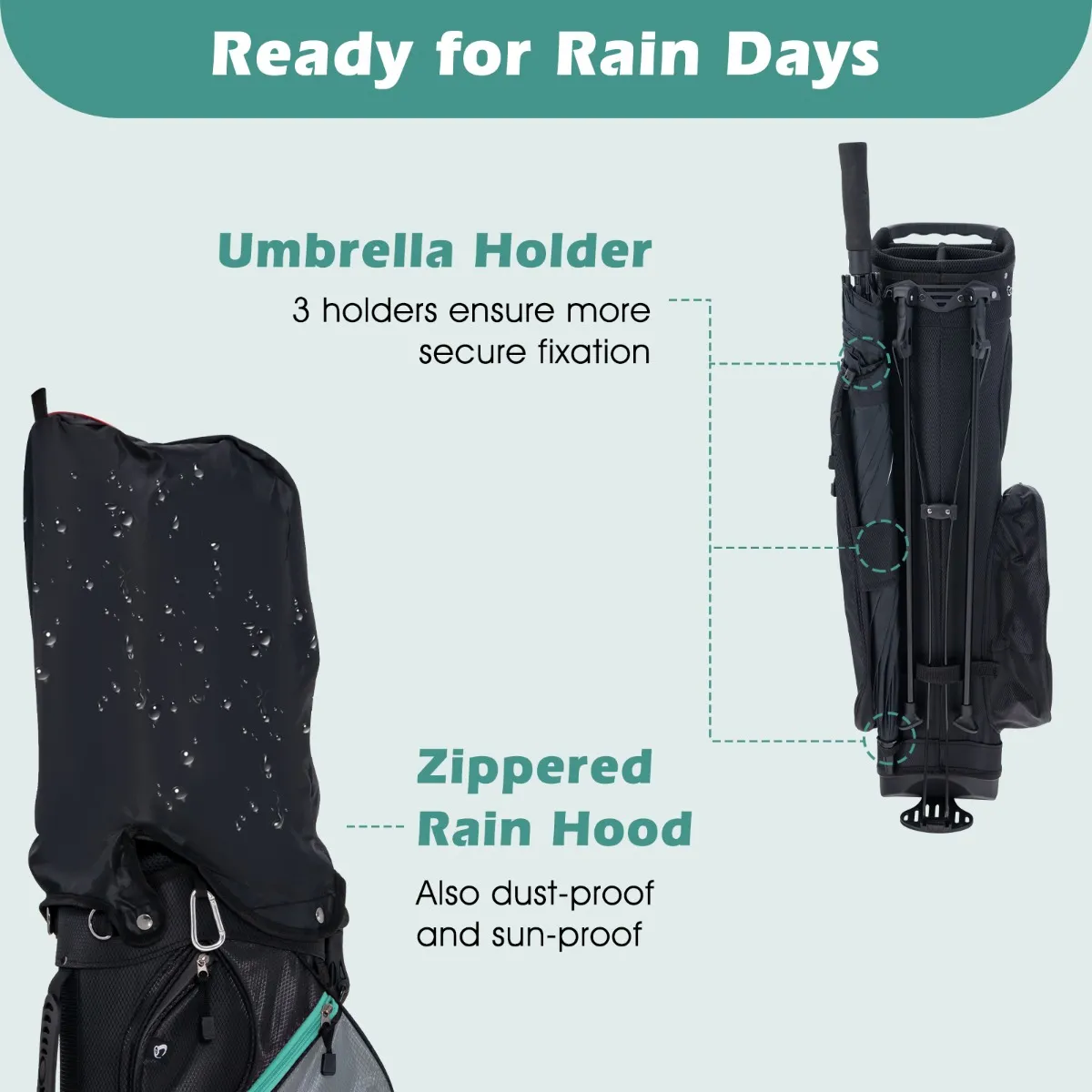 【Praktische statief tas】: De tas biedt georganiseerde opbergruimte inclusief 5-weg hoofdverdelers en 7 vakken met rits voor je clubs. De regenkap met rits is stof- en zonbestendig en beschermt je clubs tegen de elementen. De verbeterde paraplustandaard met 3 steunen zorgt dat je klaar bent voor een regenachtige dag.