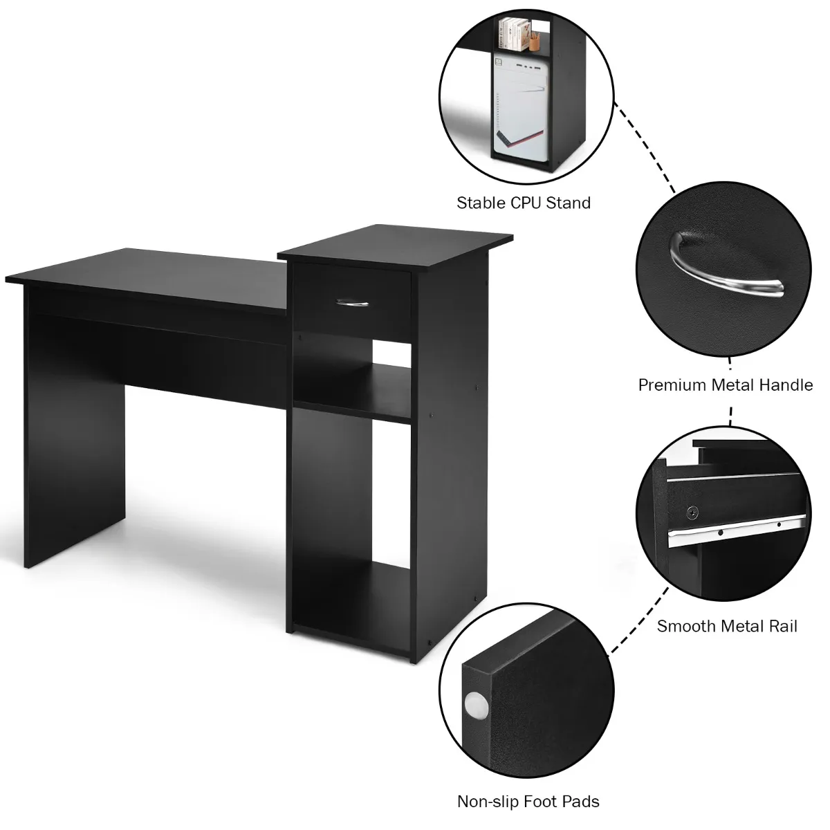 Gemaakt van stevig MDF-plaat, zal het uw stabiele plaats zijn of het nu voor kantoor, studie of spel is. De zwarte afwerking zorgt voor een zware textuur en geeft het een stijlvolle maar sobere look. 2 opbergplanken en 1 lade onder het bureaublad zijn handig voor het plaatsen van uw favoriete boeken, planten, decoraties. Door de combinatie van zilveren handgrepen en metalen schuifrails biedt deze lade u niet alleen een afgesloten ruimte, maar kunt u er ook gemakkelijk spullen in opbergen en neerzetten. Als u een dergelijk computerbureau nodig heeft, aarzel dan niet om het te kopen.