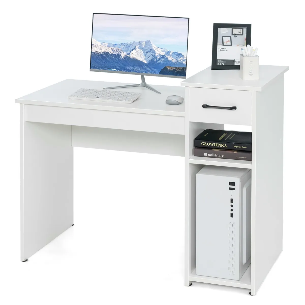Dit bureau heeft een alles-in-één ontwerp, waardoor je je spullen altijd bij de hand hebt. De brede tafel biedt optimale werkruimte en het verhoogde platform en de lade maken alles wat je erop zet toegankelijk. De 2 open opbergplanken voldoen aan uw CPU- of bestandsopslagbehoeften. De stevige constructie zorgt voor betrouwbare ondersteuning en langdurig gebruik. Bovendien past dit moderne bureau goed bij elk interieur en kan het worden gebruikt als werkplek, studeerbureau en kaptafel.